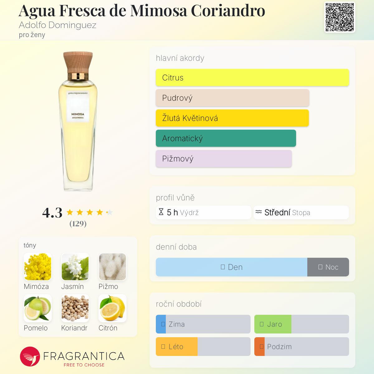 Agua Fresca de Mimosa Coriandro podle Adolfo Dominguez je Floral Woody Musk vůně pro ženy. Agua Fresca de Mimosa Coriandro byl/a uveden/a v roce 2019. "Nosem" za touto vůní je Ramon Monegal. Vrchní tóny jsou Pomelo, Citrón a Bergamot; střední tóny jsouMimóza, Jasmín a Koriandr ; základní tóny jsou Pižmo a Kašmírové dřevo.