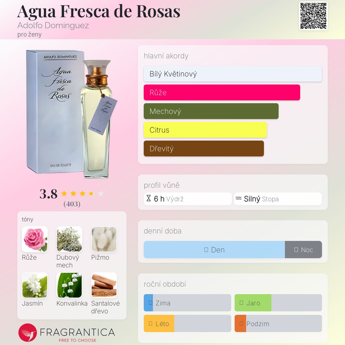 Agua Fresca de Rosas podle Adolfo Dominguez je Chypre Floral vůně pro ženy. Agua Fresca de Rosas byl/a uveden/a v roce 1995. "Nosem" za touto vůní je Ramon Monegal. Vrchní tóny jsou Bergamot, Pomelo a Mandarinka; střední tóny jsouRůže, Jasmín, Konvalinka a Lilie ; základní tóny jsou Mech, Pižmo, Santalové dřevo a Jantar (ambra).