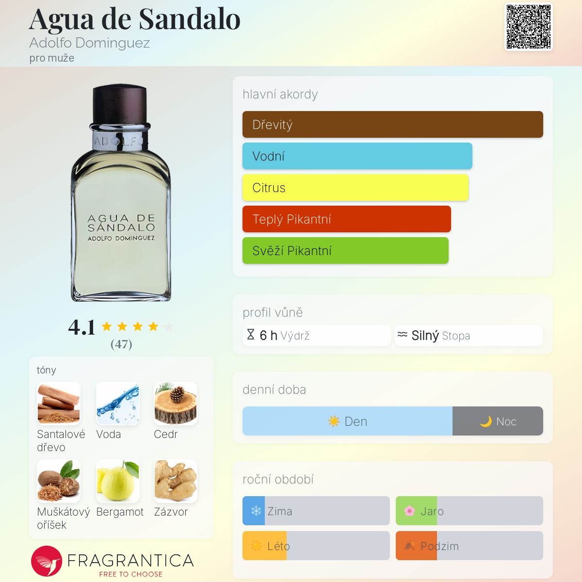 Agua de Sandalo podle Adolfo Dominguez je Woody Aquatic vůně pro muže. Agua de Sandalo byl/a uveden/a v roce 2004. "Nosem" za touto vůní je Ramon Monegal. Vrchní tóny jsou Vodní tóny, Bergamot, Mandarinka a Fialkový list; střední tóny jsouMuškátový oříšek a Zázvor ; základní tóny jsou Santalové dřevo a Virginský cedr.