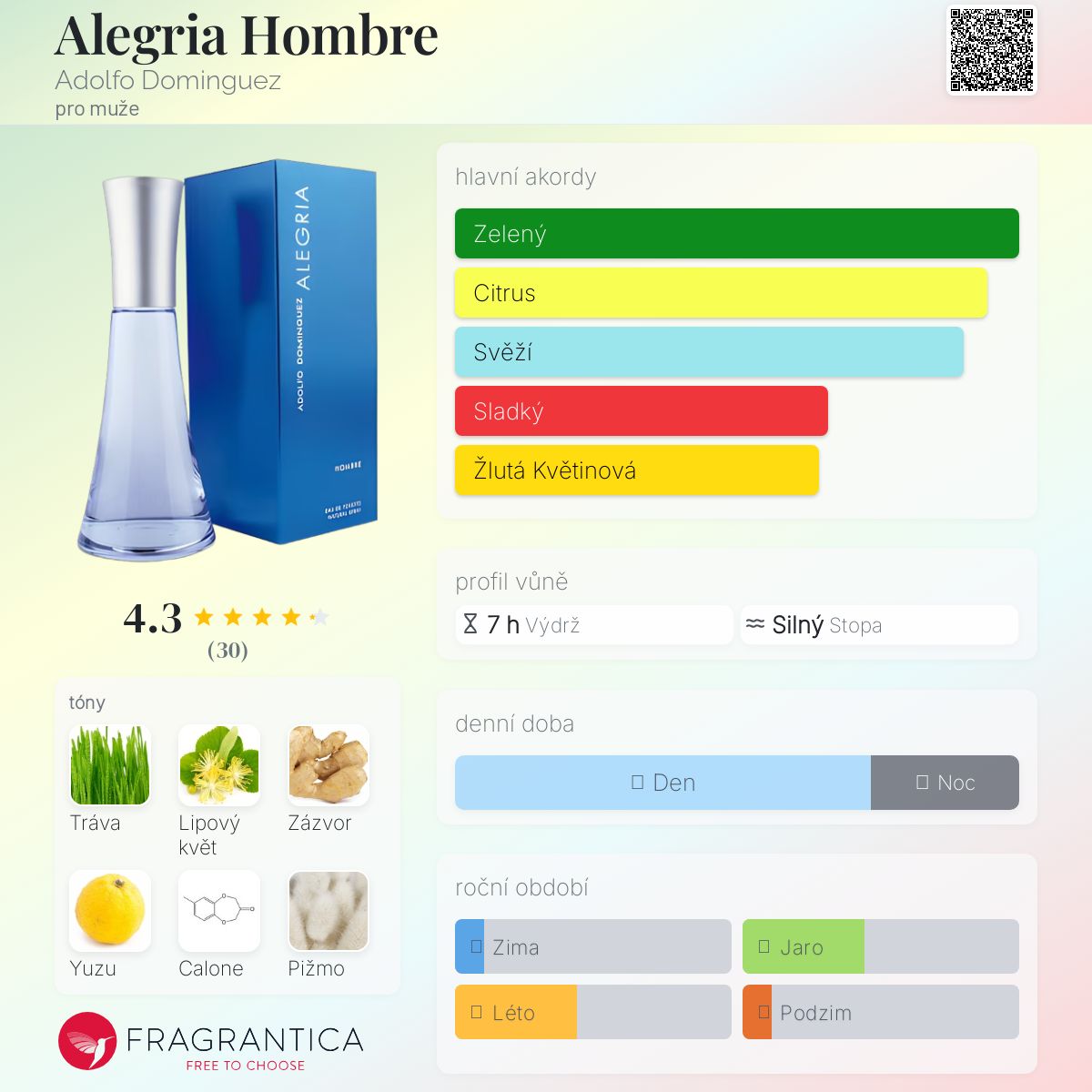Alegria Hombre podle Adolfo Dominguez je Citrus Aromatic vůně pro muže. Alegria Hombre byl/a uveden/a v roce 2000. "Nosem" za touto vůní je Ramon Monegal. Vrchní tóny jsou Tráva, Yuzu, Galbanum, Citron amalfi a Mandarinka; střední tóny jsouLipový květ, Zázvor a Calone ; základní tóny jsou Pižmo a Jantar (ambra).