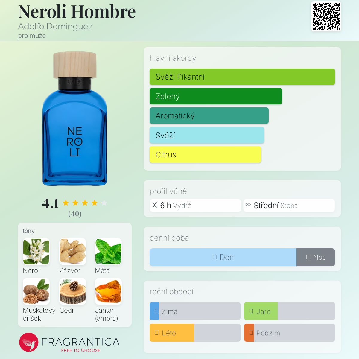 Neroli Hombre podle Adolfo Dominguez je Woody Spicy vůně pro muže. Toto je nová vůně. Neroli Hombre byl/a uveden/a v roce 2024. Vrchní tóny jsou Zázvor a Máta; střední tóny jsouNeroli a Muškátový oříšek ; základní tóny jsou Cedr a Jantar (ambra).