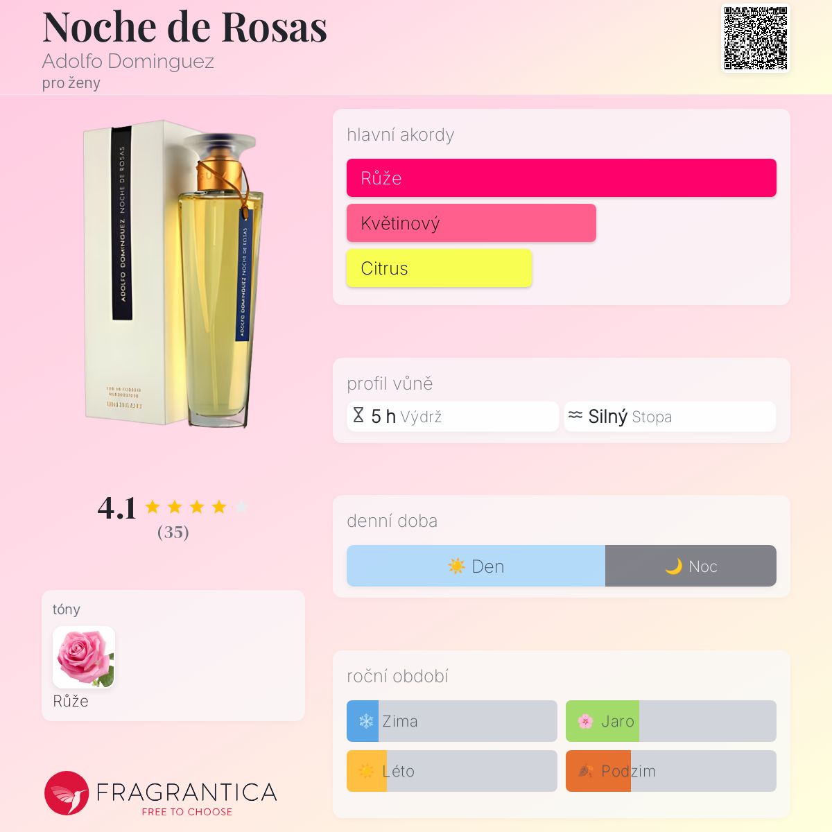 Noche de Rosas podle Adolfo Dominguez je Floral vůně pro ženy. Noche de Rosas byla spuštěna během 2000. "Nosem" za touto vůní je Ramon Monegal.