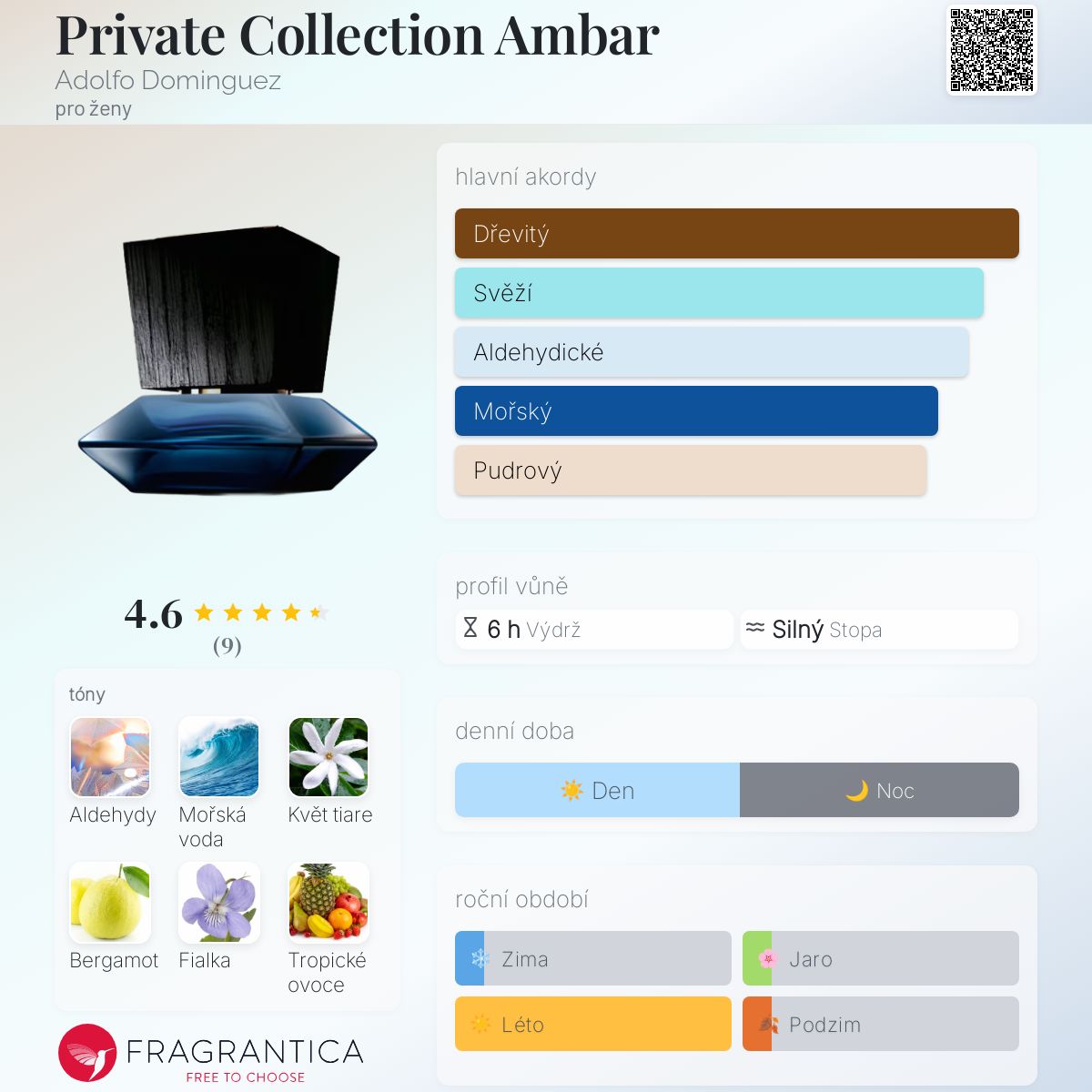 Private Collection Ambar podle Adolfo Dominguez je Woody Aquatic vůně pro ženy. Private Collection Ambar byl/a uveden/a v roce 2010. "Nosem" za touto vůní je Ramon Monegal. Vrchní tóny jsou Aldehydy, Mořská voda a Bergamot; střední tóny jsouKvět tiare, Fialka a Tropické ovoce ; základní tóny jsou Virginský cedr, Jantar (ambra) a Pačuli.