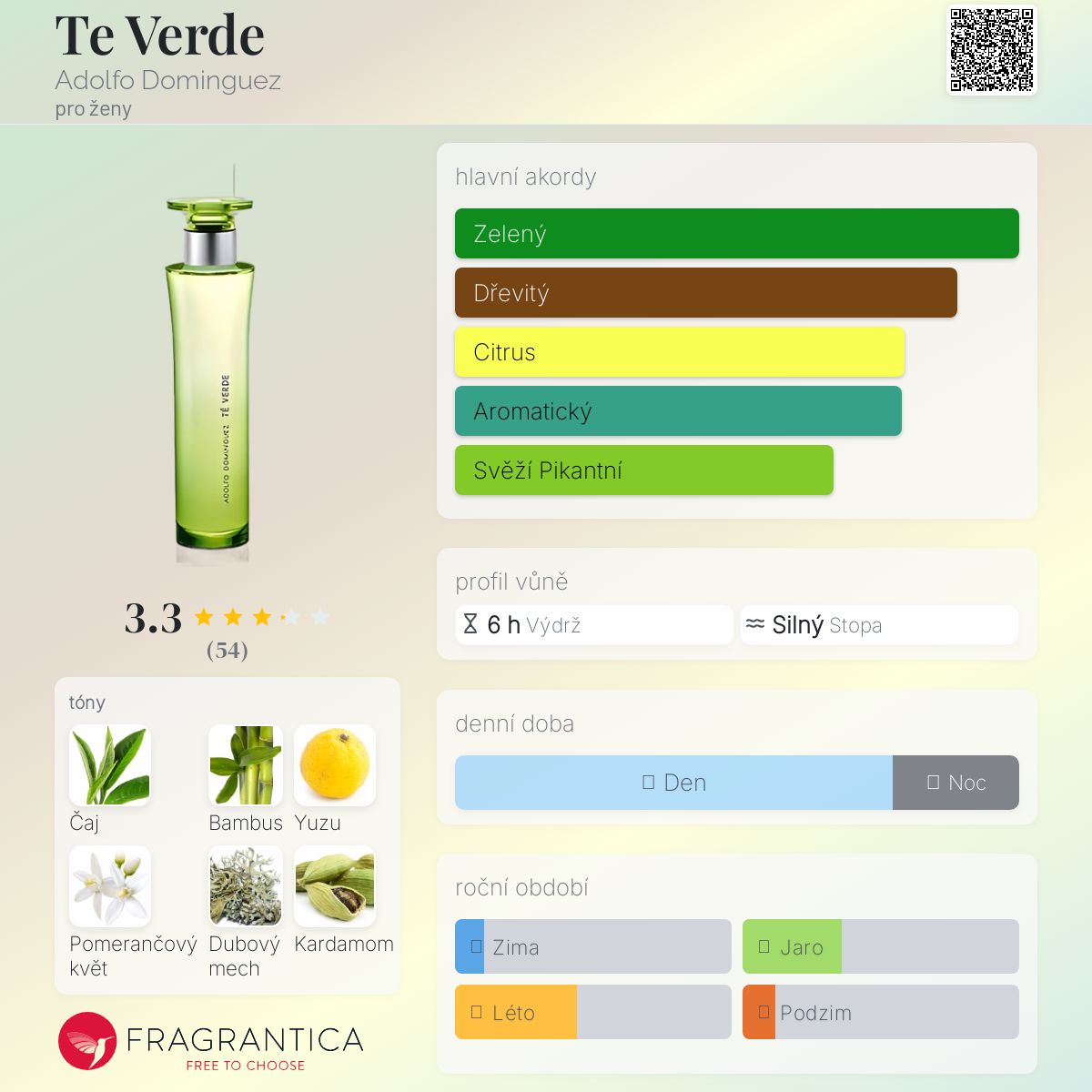 Te Verde podle Adolfo Dominguez je Aromatic Green vůně pro ženy. Te Verde byl/a uveden/a v roce 2006. "Nosem" za touto vůní je Ramon Monegal. Vrchní tóny jsou Čaj, Bambus, Yuzu a Máta; střední tóny jsouKvět afrického pomeranče, Kardamom, Cesmína, Frézie a Koriandr ; základní tóny jsou Dubový mech, Guajakové dřevo a Jantar (ambra).