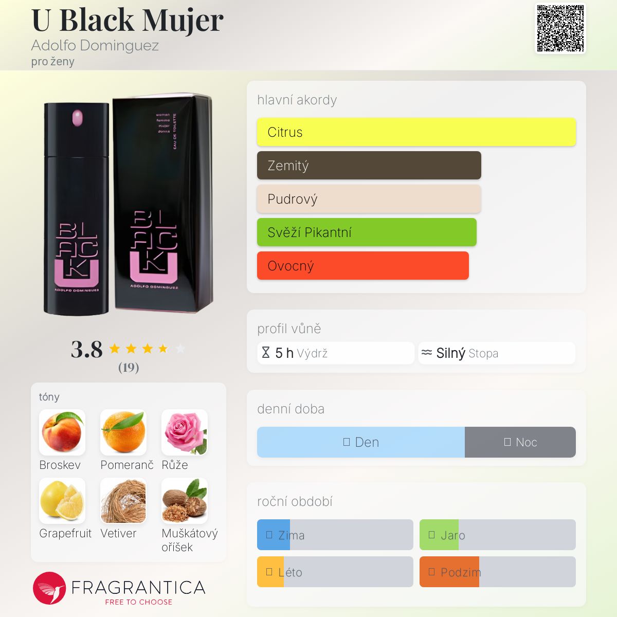 U Black Mujer podle Adolfo Dominguez je Chypre Floral vůně pro ženy. U Black Mujer byl/a uveden/a v roce 2005. "Nosem" za touto vůní je Ramon Monegal. Vrchní tóny jsou Broskev, Pomeranč, Grapefruit a Mandarinka; střední tóny jsouRůže, Muškátový oříšek, Kosatec a Tuberóza ; základní tóny jsou Vetiver, Pižmo, Dubový mech a Jantar (ambra).