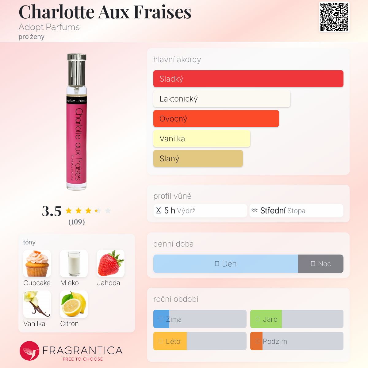 Charlotte Aux Fraises podle Adopt Parfums je Floral Fruity Gourmand vůně pro ženy. Vrchní tón je Citrón ; střední tóny jsouCupcake, Mléko a Velká jahoda ; základní tón je Vanilka.