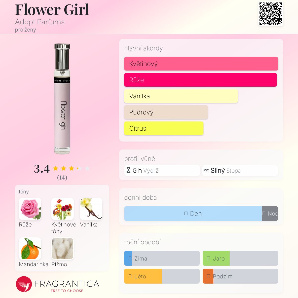 Flower Girl podle Adopt Parfums je Floral vůně pro ženy. Vrchní tón je Mandarinka ; střední tóny jsouRůže a Květinové tóny ; základní tóny jsou Vanilka a Pižmo.