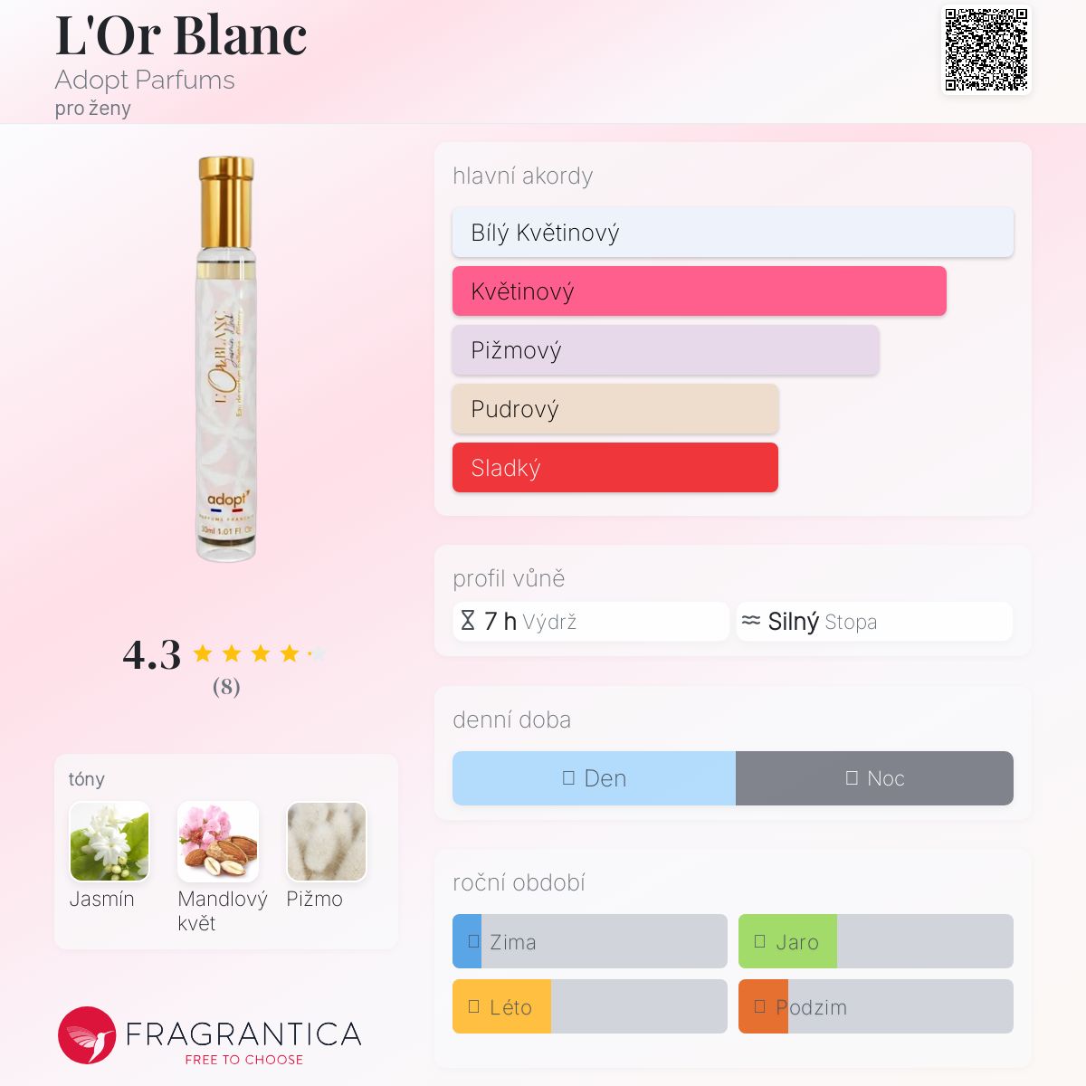 L'Or Blanc podle Adopt Parfums je Floral vůně pro ženy. "Nosem" za touto vůní je Amandine Clerc-Marie. Vrchní tón je Mandlový květ ; střední tón jeIndický jasmín ; základní tón je Bílé pižmo.