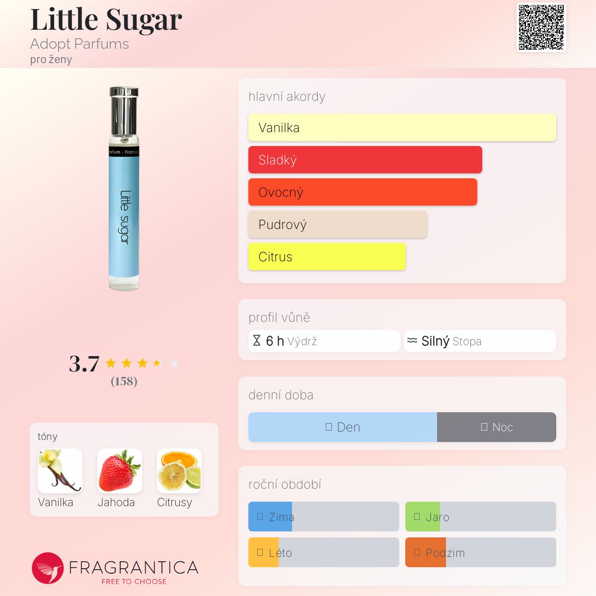 Little Sugar podle Adopt Parfums je Citrus Gourmand vůně pro ženy. Vrchní tón je Citrusy ; střední tón jeVelká jahoda ; základní tón je Vanilka.