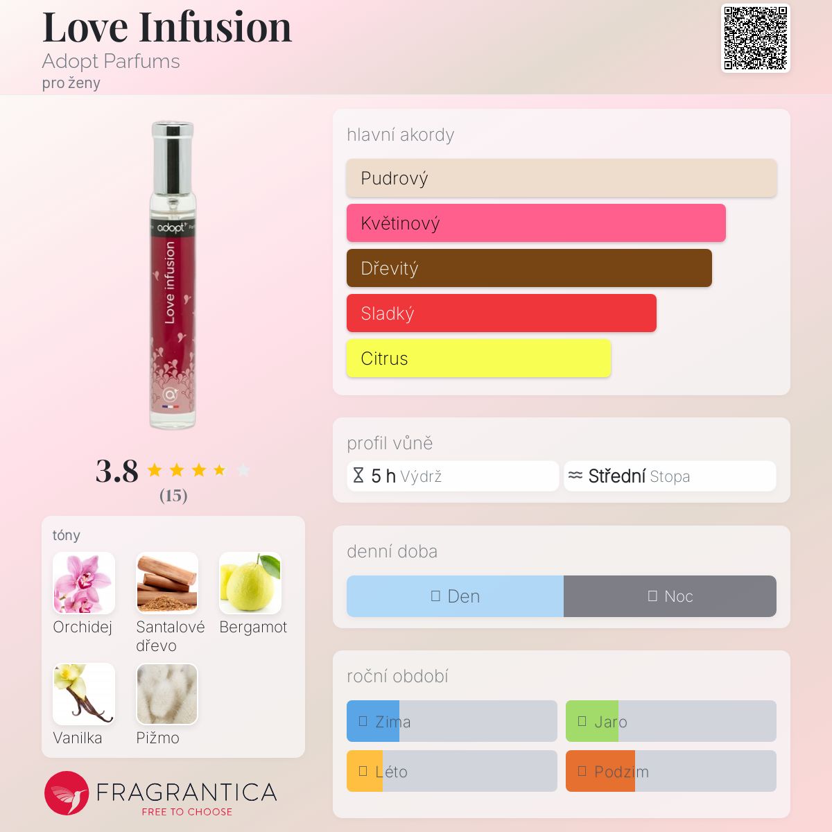 Love Infusion podle Adopt Parfums je vůně pro ženy. Vrchní tón je Bergamot ; střední tóny jsouOrchidej a Santalové dřevo ; základní tóny jsou Vanilka a Pižmo.