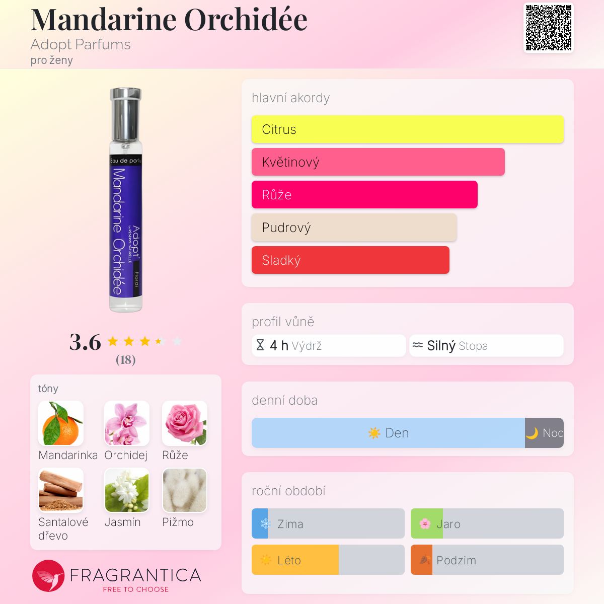 Mandarine Orchidée podle Adopt Parfums je Floral Fruity vůně pro ženy. Vrchní tón je Mandarinka ; střední tóny jsouOrchidej, Růže a Jasmín ; základní tóny jsou Santalové dřevo a Pižmo.