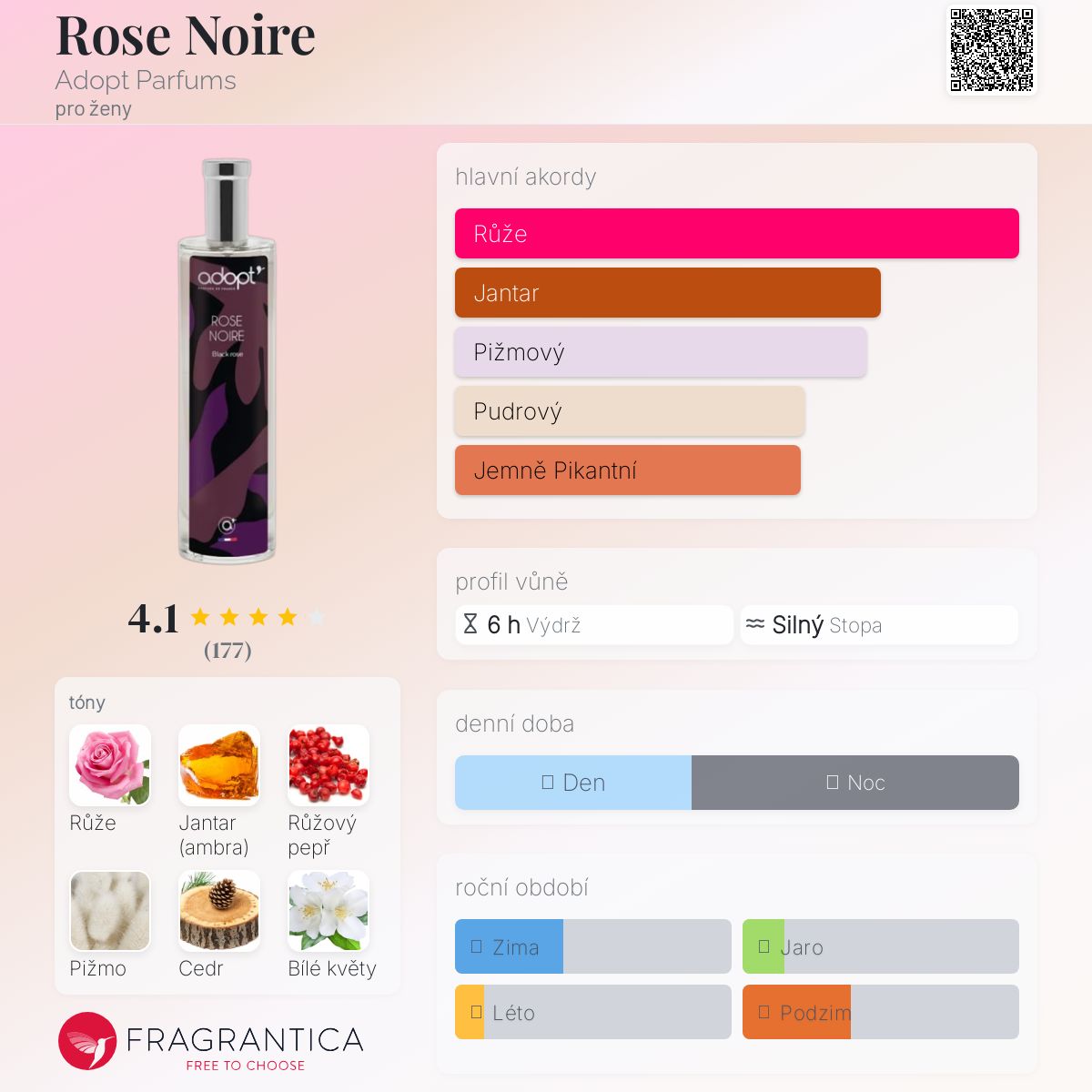 Rose Noire podle Adopt Parfums je vůně pro ženy. Vrchní tón je Růžový pepř ; střední tóny jsouBulharská růže a Bílé květy ; základní tóny jsou Jantar (ambra), Pižmo a Cedr.