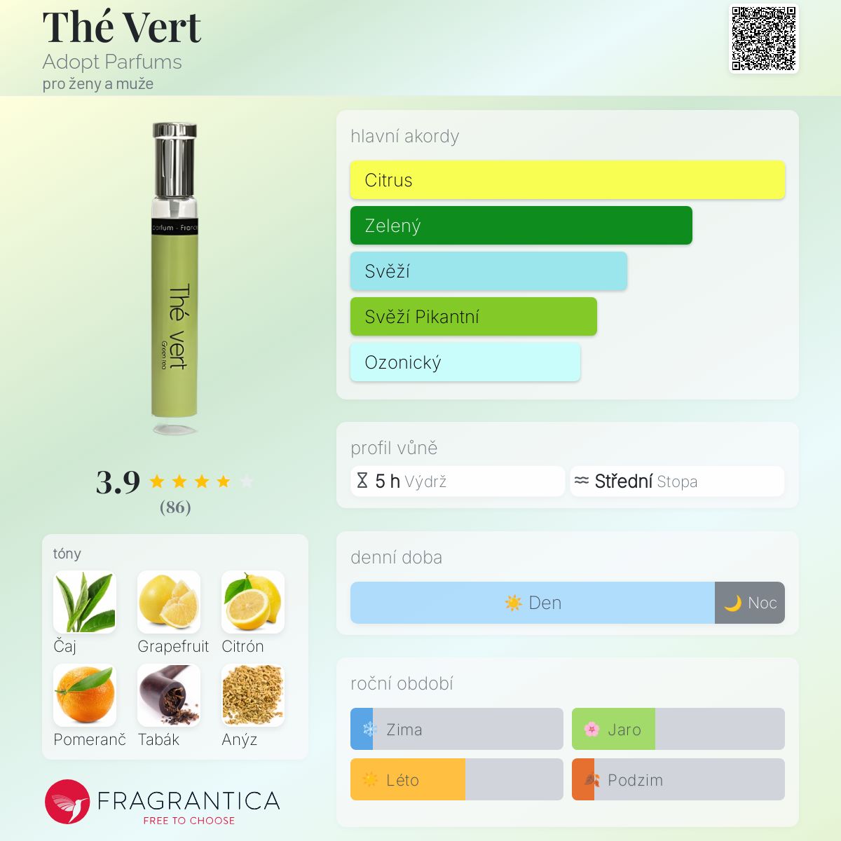 Thé Vert podle Adopt Parfums je Citrus Aromatic vůně pro ženy a muže. Vrchní tóny jsou Grapefruit, Citrón, Pomeranč a Anýz; střední tóny jsouZelený čaj a Růže ; základní tóny jsou Tabák a Dřevité tóny.