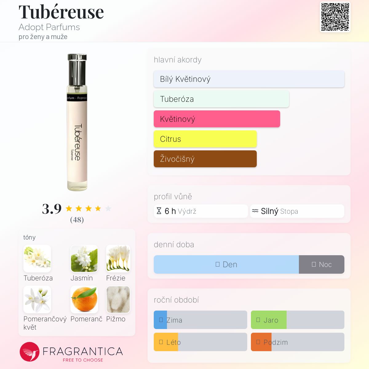 Tubéreuse podle Adopt Parfums je Floral vůně pro ženy a muže. "Nosem" za touto vůní je Dominique Monlun. Vrchní tóny jsou Pomerančový květ, Pomeranč a Hřebíček; střední tóny jsouTuberóza, Jasmín a Frézie ; základní tóny jsou Pižmo a Dřevité tóny.