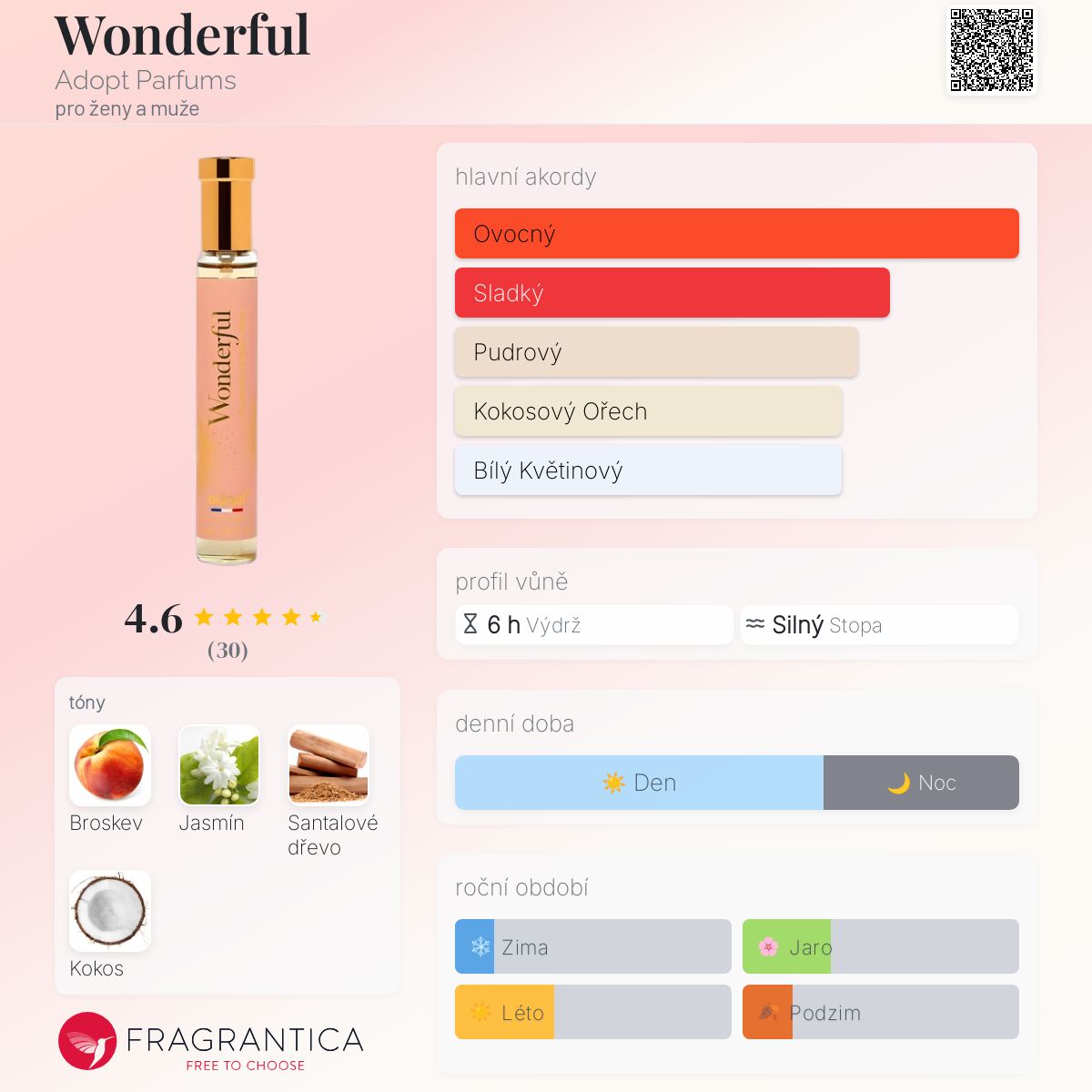 Wonderful podle Adopt Parfums je Floral Fruity vůně pro ženy a muže. Wonderful byl/a uveden/a v roce 2024. Vrchní tón je Bílá broskev ; střední tón jeJasmín ; základní tóny jsou Kokos a Santalové dřevo.