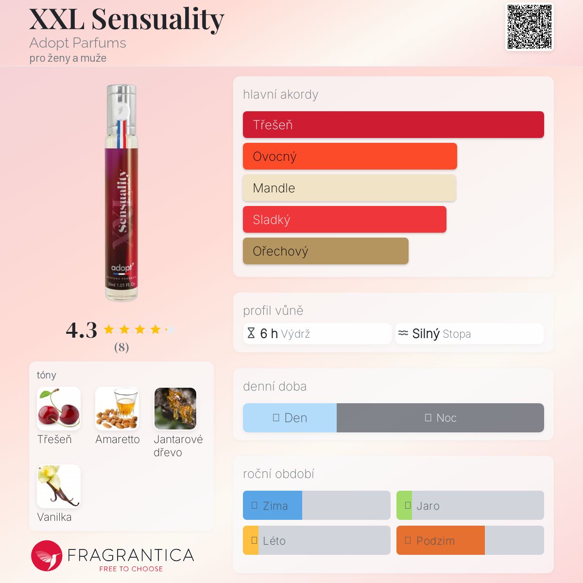 XXL Sensuality podle Adopt Parfums je Floral Fruity Gourmand vůně pro ženy a muže. XXL Sensuality byl/a uveden/a v roce 2024. "Nosem" za touto vůní je Ilias Ermenidis. Vrchní tón je Třešeň ; střední tóny jsouAmaretto a Jantarové dřevo ; základní tón je Vanilka.