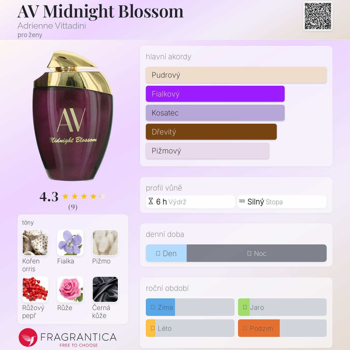 AV Midnight Blossom podle Adrienne Vittadini je vůně pro ženy. Vrchní tóny jsou Orris a Růžový pepř; střední tóny jsouFialka a Žlutá růže ; základní tóny jsou Pižmo, Černá kůže, Pačuli a Dřevité tóny.