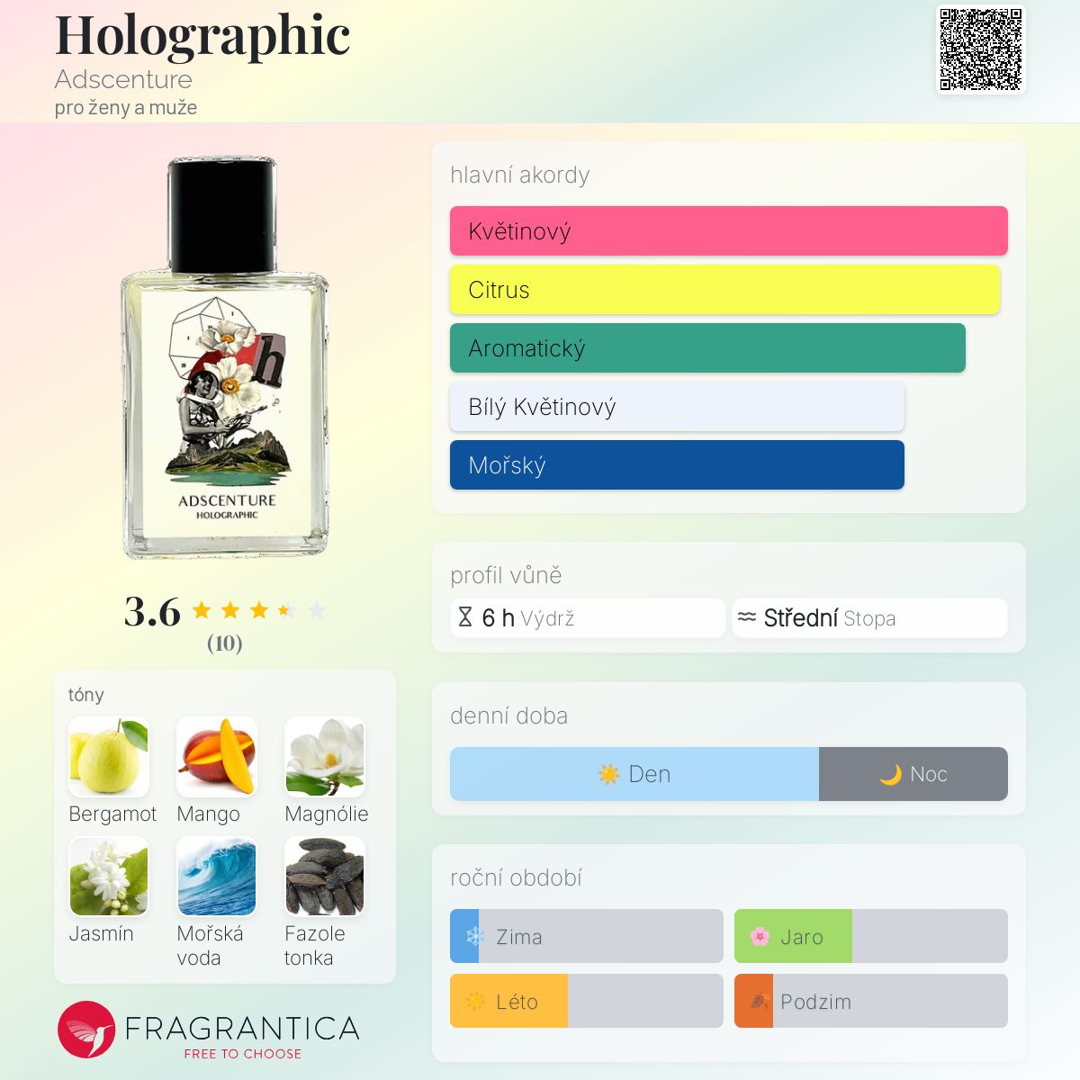 Holographic podle Adscenture je Orientální Floral vůně pro ženy a muže. Holographic byl/a uveden/a v roce 2023. "Nosem" za touto vůní je Tristan Badard. Vrchní tóny jsou Bergamot, Mango a Magnólie; střední tóny jsouJasmín, Mořské tóny a Růže ; základní tóny jsou Fazole tonka, Cedr a Santalové dřevo.