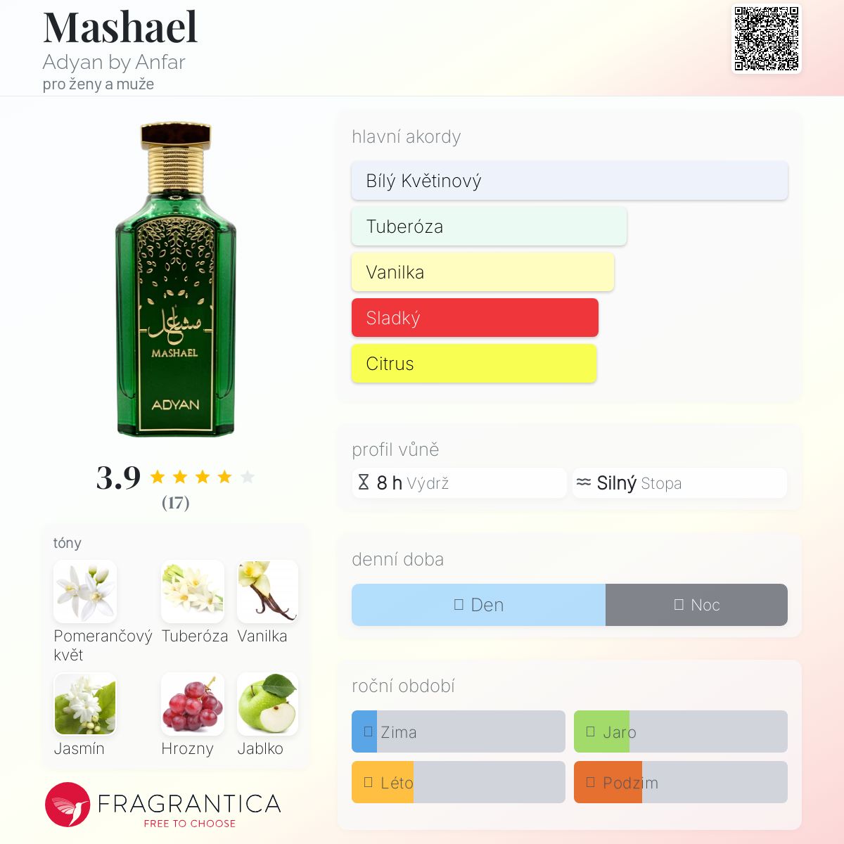 Mashael podle Adyan by Anfar je Orientální Floral vůně pro ženy a muže. Mashael byl/a uveden/a v roce 2022. Vrchní tóny jsou Pomerančový květ, Hrozny, Jablko a Pomeranč; střední tóny jsouTuberóza, Pomerančový květ a Jasmín Sambac ; základní tóny jsou Vanilka, Pačuli, Ambroxan a Vetiver.