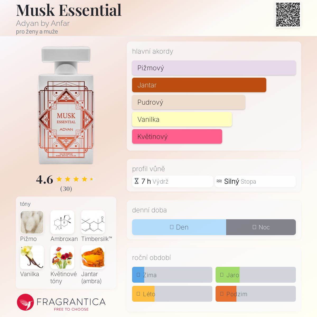Musk Essential podle Adyan by Anfar je Woody Floral Musk vůně pro ženy a muže. Musk Essential byl/a uveden/a v roce 2021. Vrchní tóny jsou Bílé pižmo a Květinové tóny; střední tóny jsouVanilka a Jemný jantar (ambra) ; základní tóny jsou Pižmo, Ambroxan a Timbersilk™.