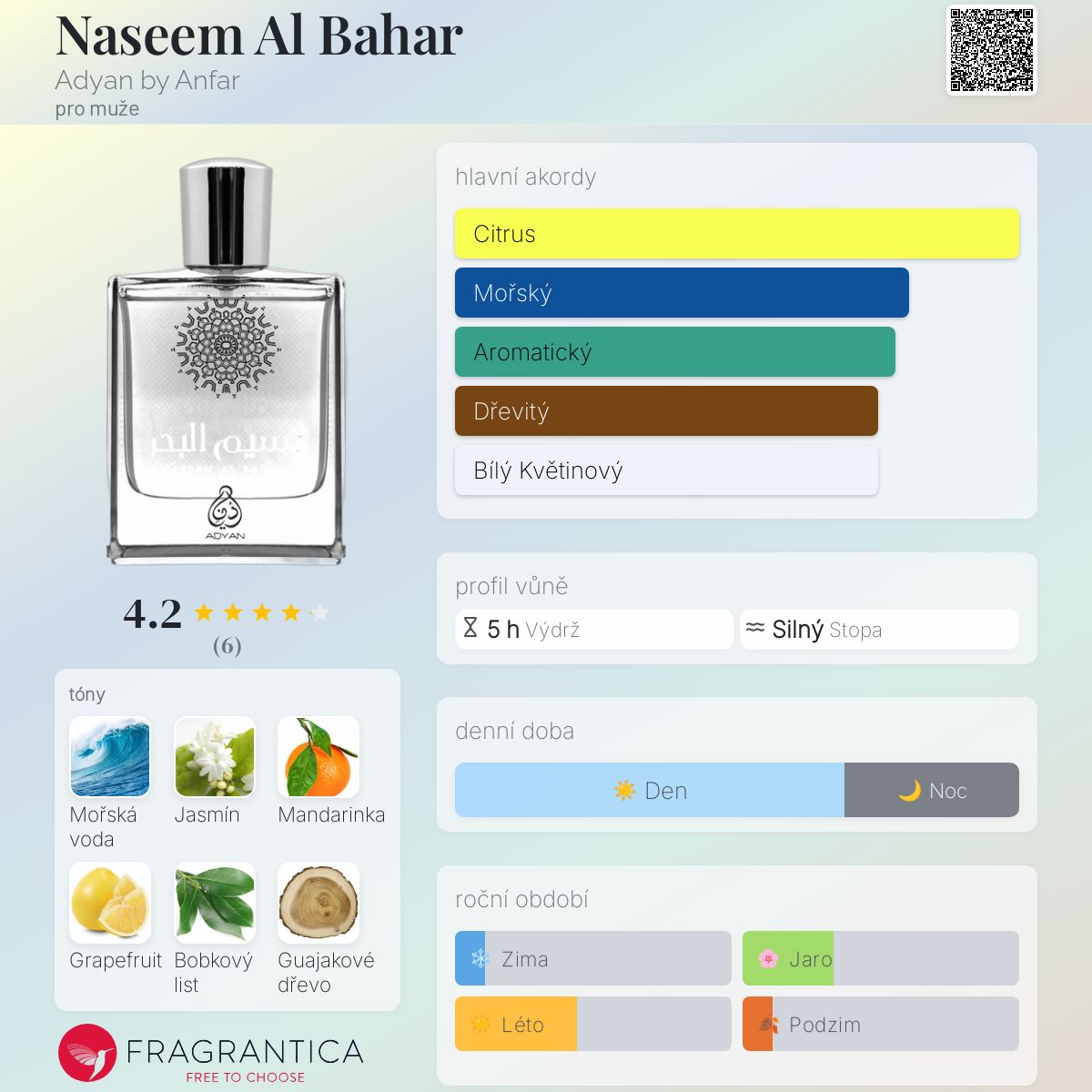 Naseem Al Bahar podle Adyan by Anfar je Woody Aromatic vůně pro muže. Naseem Al Bahar byl/a uveden/a v roce 2020. Vrchní tóny jsou Mořské tóny, Mandarinka a Grapefruit; střední tóny jsouJasmín a Bobkový list ; základní tóny jsou Guajakové dřevo, Dubový mech, Pačuli a Ambra.