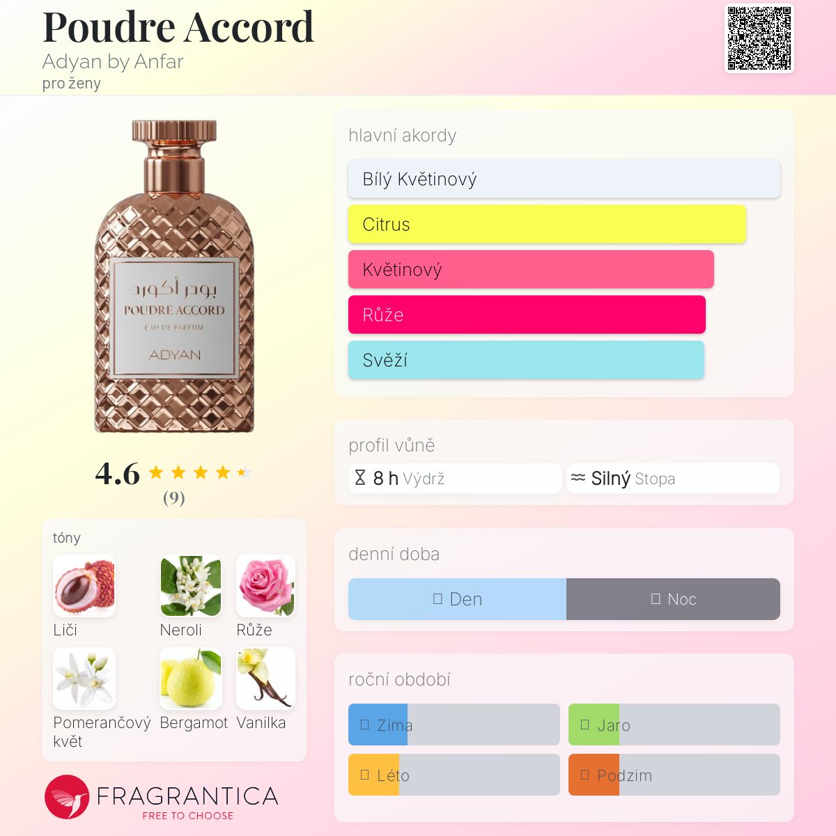 Poudre Accord podle Adyan by Anfar je Orientální Floral vůně pro ženy. Poudre Accord byl/a uveden/a v roce 2022. "Nosem" za touto vůní je Ahmedullah Anfar. Vrchní tóny jsou Liči, Neroli, Bergamot a Růžový pepř; střední tóny jsouTurecká růže, Pomerančový květ, Vanilka, Pivoňka a Jasmín ; základní tóny jsou Kašmír, Karamel, Cedr, Cukr a Kadidlo.