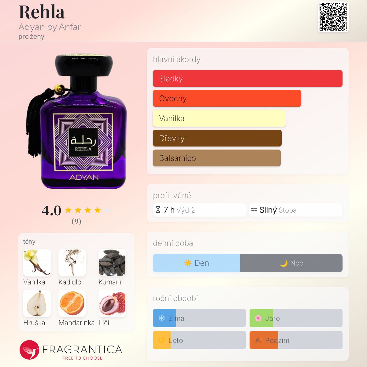 Rehla podle Adyan by Anfar je Orientální Vanilla vůně pro ženy. Rehla byl/a uveden/a v roce 2020. Vrchní tóny jsou Hruška, Mandarinka, Liči a Bergamot; střední tóny jsouJahoda, Vanilková orchidej a Káva ; základní tóny jsou Vanilka, Kadidlo, Kumarin, Pralinka, Karamel, Pačuli, Lékořice a Papyrus.