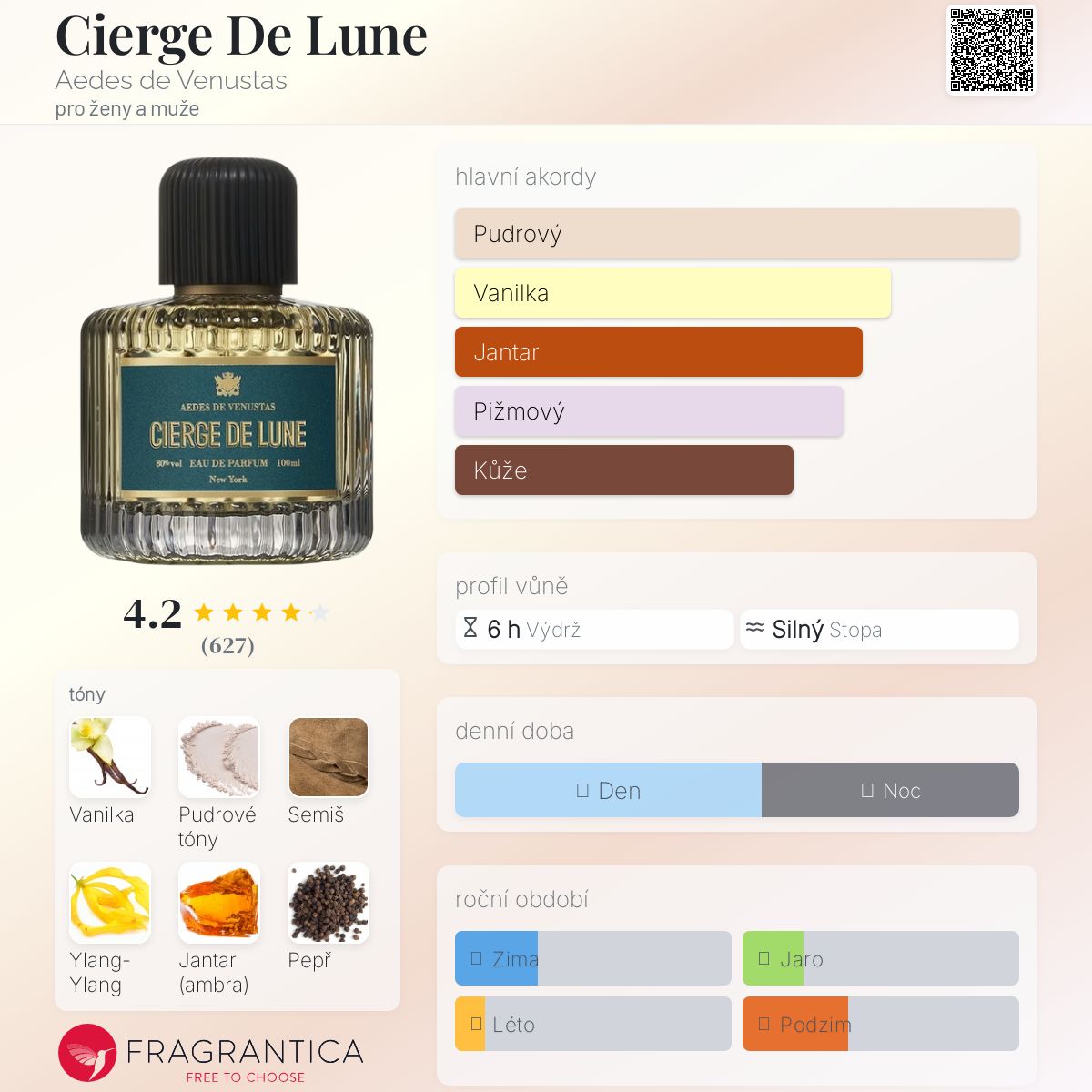 Cierge De Lune podle Aedes de Venustas je Orientální Floral vůně pro ženy a muže. Cierge De Lune byl/a uveden/a v roce 2016. "Nosem" za touto vůní je Fabrice Pellegrin. Vrchní tóny jsou Pudrové tóny a Pižmo; střední tóny jsouMadagaskarská vanilka, Ylang-Ylang, Černý a růžový pepř a Hedione ; základní tóny jsou Semiš, Jantar (ambra), Kadidlo a Pižmo.