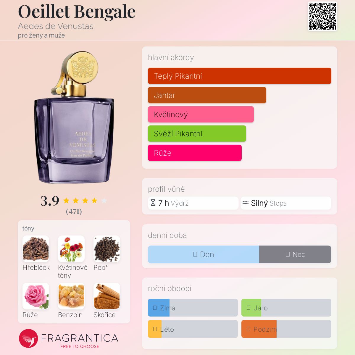 Oeillet Bengale podle Aedes de Venustas je Orientální vůně pro ženy a muže. Oeillet Bengale byl/a uveden/a v roce 2014. "Nosem" za touto vůní je Rodrigo Flores-Roux. Vrchní tóny jsou Hřebíček, Černý pepř, Skořice, Kurkuma, Šafrán a Kardamom; střední tóny jsouKvětinové tóny, Bílý pepř, Růže a Velká jahoda ; základní tóny jsou Benzoin, Labdanum, Balzám Tolu a Vanilka.