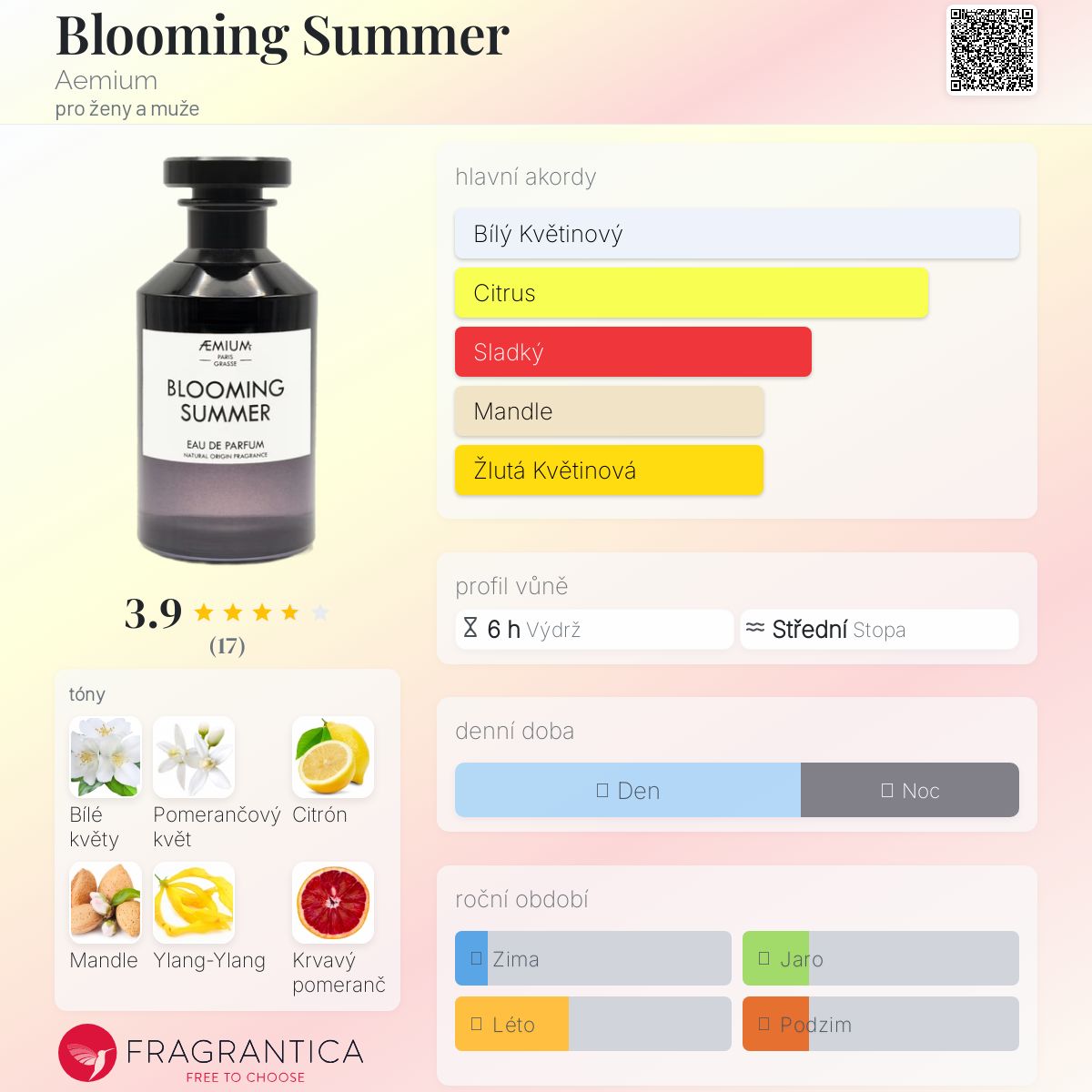Blooming Summer podle Aemium je Floral Fruity vůně pro ženy a muže. Blooming Summer byl/a uveden/a v roce 2021. Vrchní tóny jsou Citrón, Mandle a Krvavý pomeranč; střední tóny jsouPomerančový květ, Ylang-Ylang a Monoi olej ; základní tóny jsou Bílé květy, Vanilka a Cedr.
