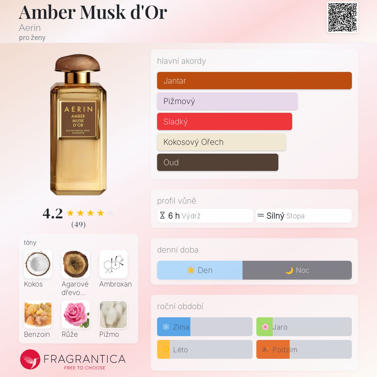 Amber Musk d'Or podle Aerin je Orientální Floral vůně pro ženy. Amber Musk d'Or byl/a uveden/a v roce 2017. Vrchní tóny jsou Kokosový nektar a Magnólie; střední tóny jsouKvětná růže a Konvalinka ; základní tóny jsou Agarové dřevo (oud), Ambroxan, Benzoin, Pižmo, Kadidlo a Pralinka.