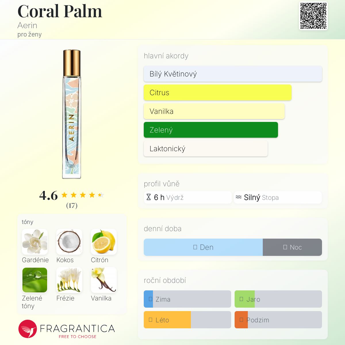 Coral Palm podle Aerin je Floral vůně pro ženy. Coral Palm byl/a uveden/a v roce 2018. Vrchní tóny jsou Sicilský citron, Zelené tóny, Okvětní lístky frézie a Bergamot; střední tóny jsouGardénie, Tuberóza, Ylang-Ylang a Otočník ; základní tóny jsou Kokosové mléko, Vanilka a Cedr.