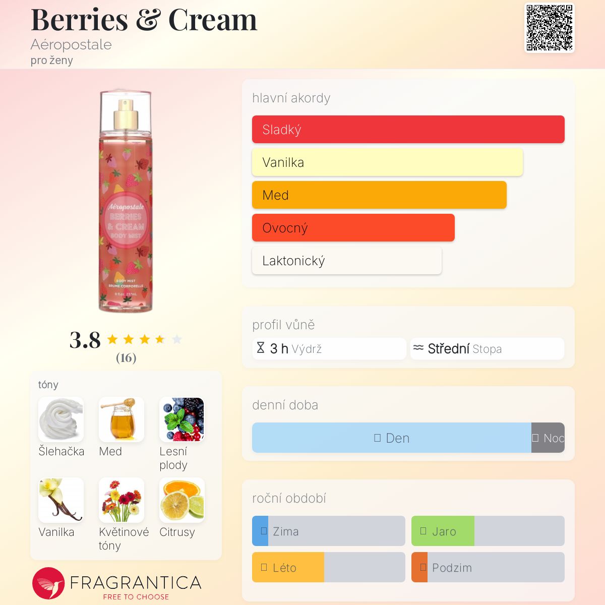 Berries & Cream podle Aéropostale je Floral Fruity Gourmand vůně pro ženy. Berries & Cream byl/a uveden/a v roce 2022. Vrchní tóny jsou Lesní plody, Citrusy a Citrónová kůra; střední tóny jsouMed a Květiny ; základní tóny jsou Šlehačka a Vanilka.