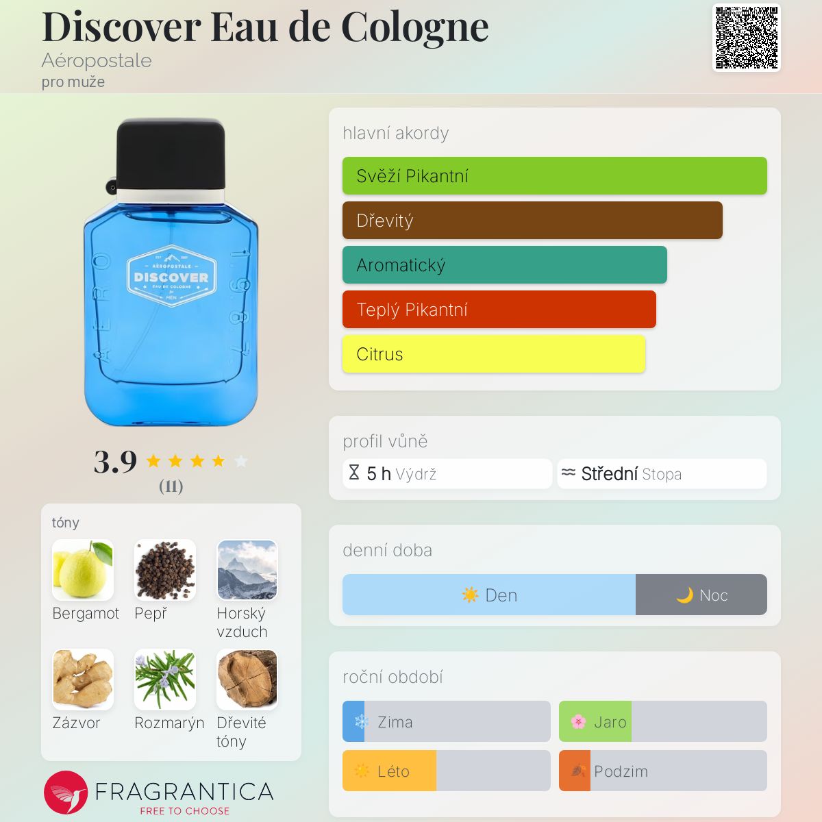 Discover Eau de Cologne podle Aéropostale je Aromatic Spicy vůně pro muže. Discover Eau de Cologne byl/a uveden/a v roce 2020. Vrchní tóny jsou Bergamot, Černý pepř a Horský vzduch; střední tóny jsouZázvor a Rozmarýn ; základní tóny jsou Dřevité tóny a Mech.