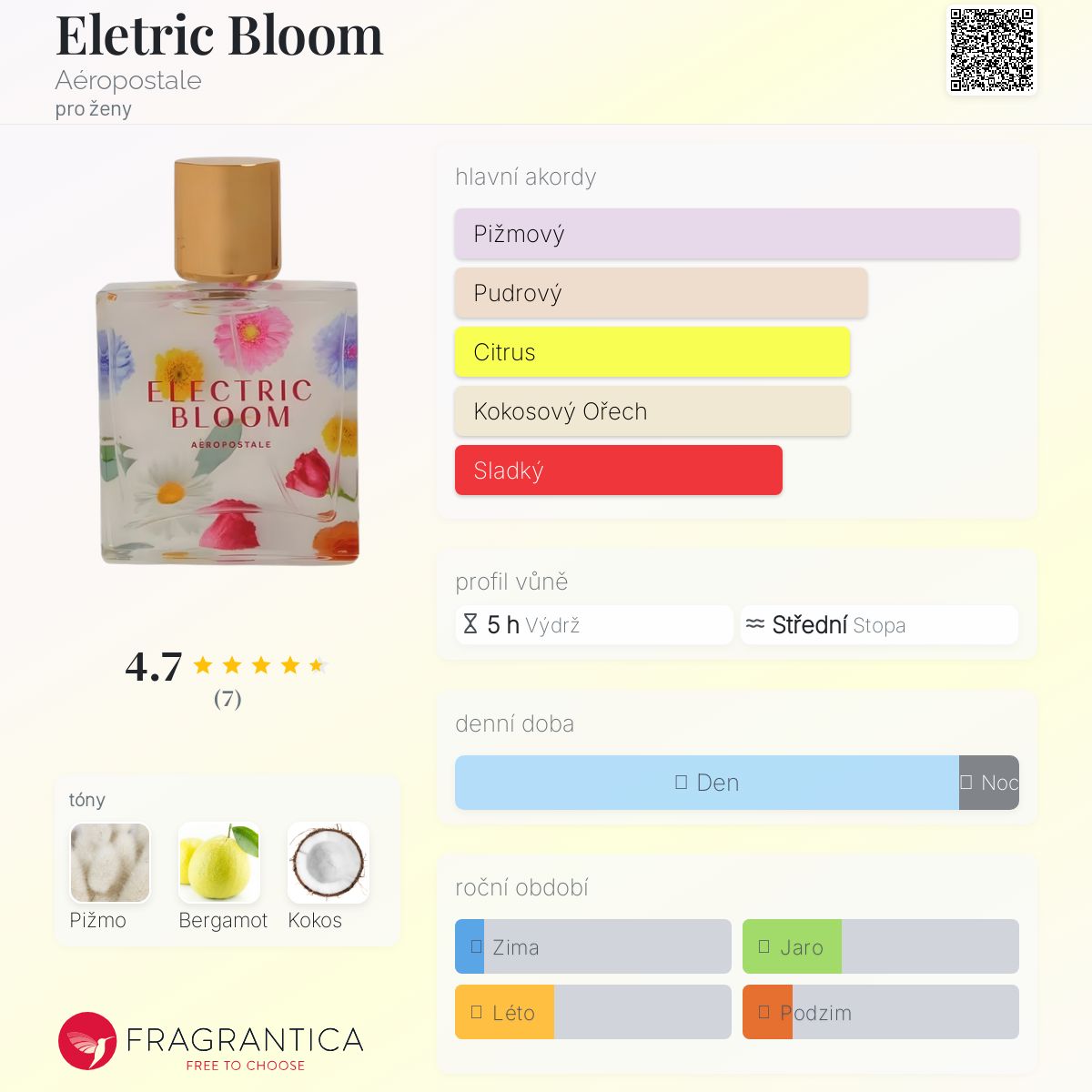 Eletric Bloom podle Aéropostale je Floral vůně pro ženy. Eletric Bloom byl/a uveden/a v roce 2020. Vrchní tón je Bergamot ; střední tón jeKokos ; základní tón je Pižmo.