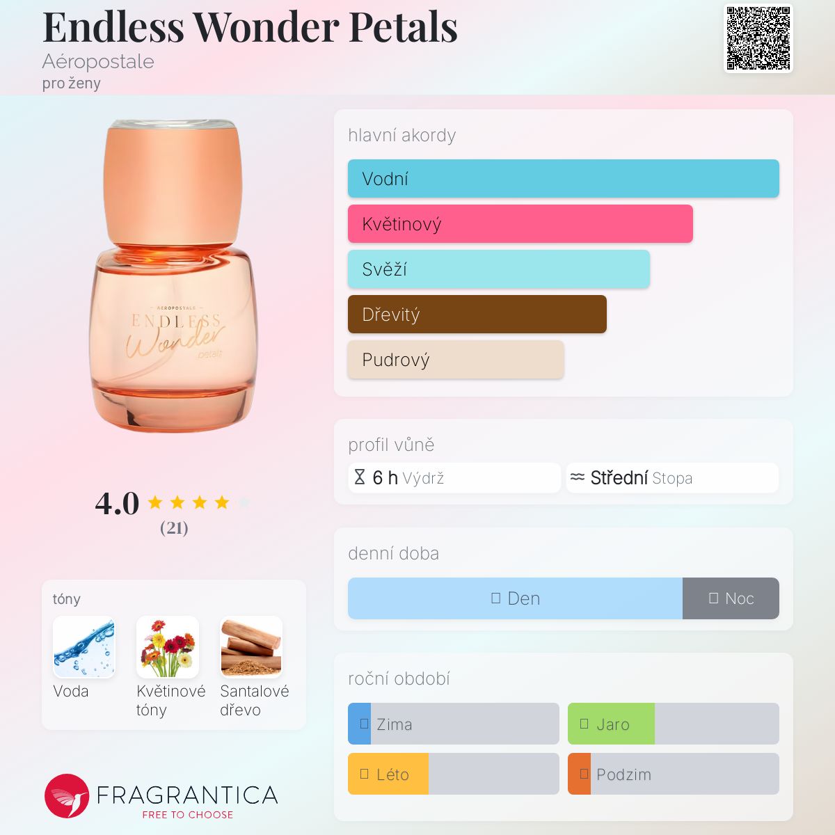 Endless Wonder Petals podle Aéropostale je Floral Aquatic vůně pro ženy. Endless Wonder Petals byl/a uveden/a v roce 2020. Vrchní tón je Květiny ; střední tón jeVodnaté tóny ; základní tón je Santalové dřevo.