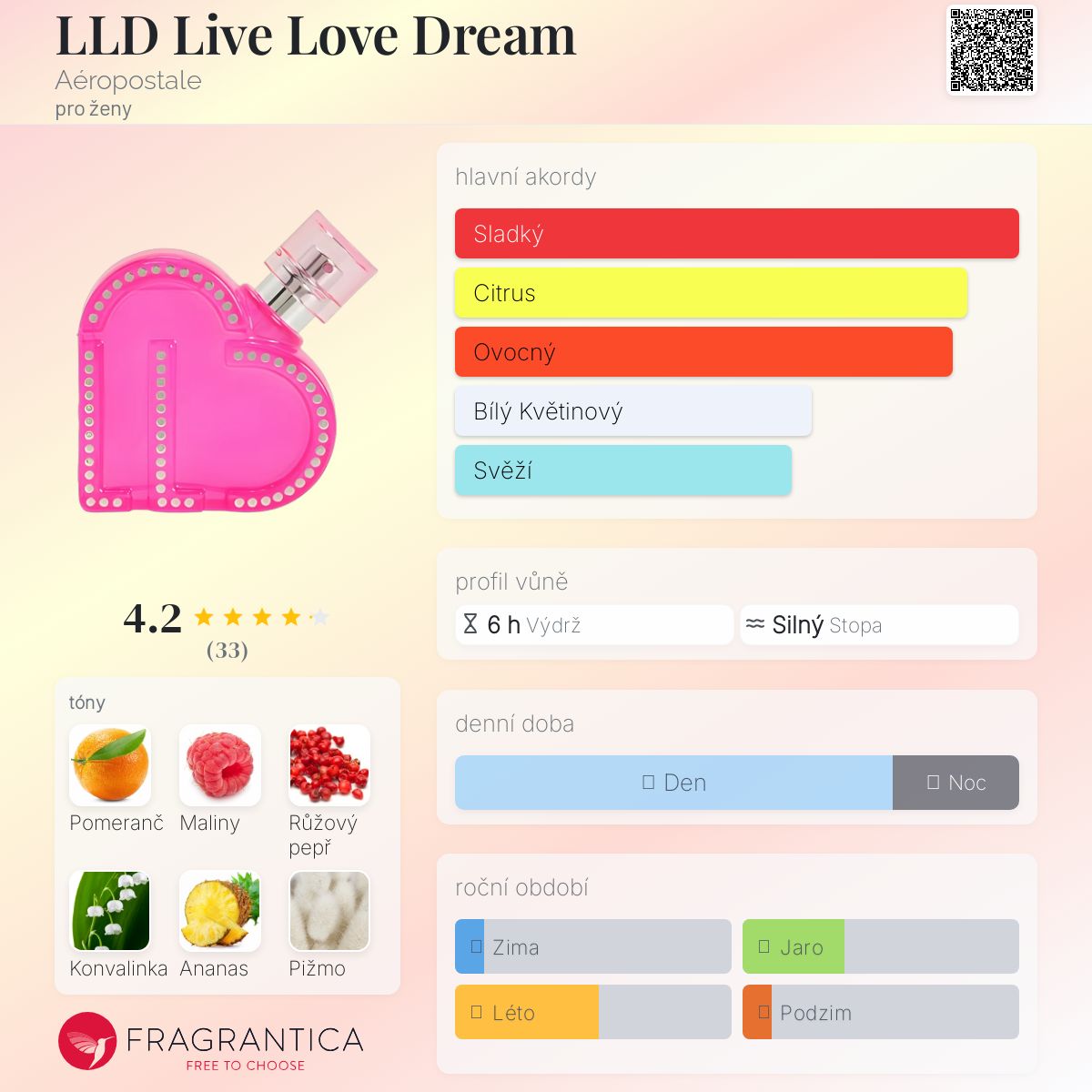LLD Live Love Dream podle Aéropostale je Floral Fruity vůně pro ženy. LLD Live Love Dream byl/a uveden/a v roce 2013. Vrchní tóny jsou Pomeranč, Růžový pepř a Ananas; střední tón jeKonvalinka ; základní tóny jsou Maliny, Pižmo a Bílé dřevo.