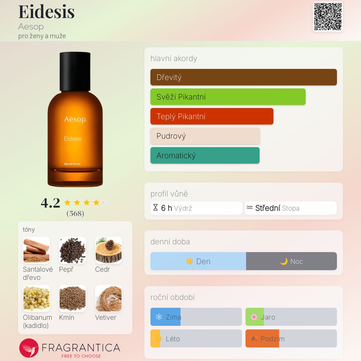 Eidesis podle Aesop je Orientální Woody vůně pro ženy a muže. Eidesis byl/a uveden/a v roce 2022. Vrchní tóny jsou Černý pepř, Olibanum a Petitgrain; střední tóny jsouCedr, Olibanum a Římský kmín ; základní tóny jsou Santalové dřevo, Cedr a Vetiver.