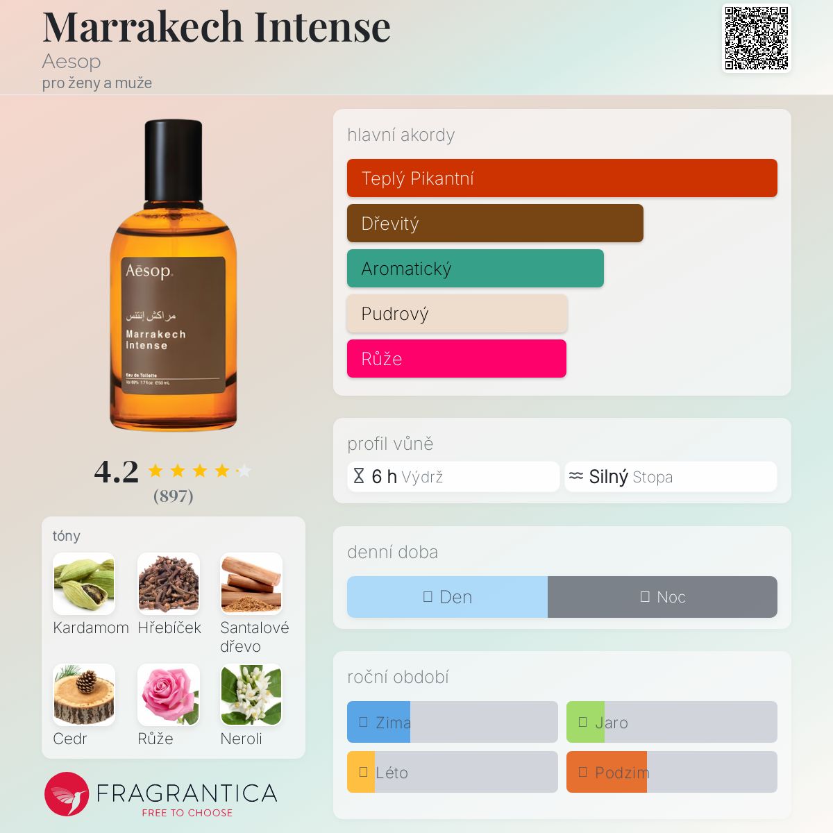 Marrakech Intense podle Aesop je Orientální Floral vůně pro ženy a muže. Marrakech Intense byl/a uveden/a v roce 2014. "Nosem" za touto vůní je Barnabé Fillion. Vrchní tóny jsou Kardamom, Hřebíček a Bergamot; střední tóny jsouRůže, Jasmín a Neroli ; základní tóny jsou Santalové dřevo a Cedr.