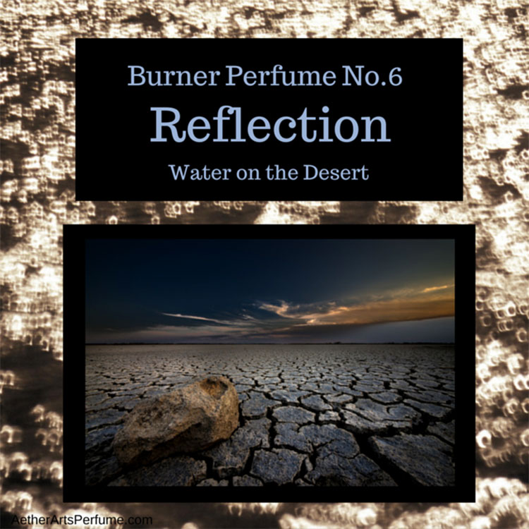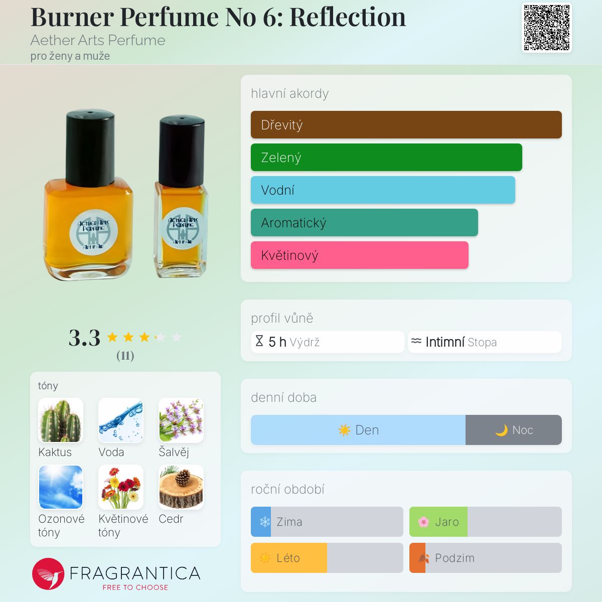Burner Perfume No 6: Reflection podle Aether Arts Perfume je Aromatic vůně pro ženy a muže. Burner Perfume No 6: Reflection byl/a uveden/a v roce 2015. "Nosem" za touto vůní je Amber Jobin. Vrchní tóny jsou Šalvěj a Ozonové tóny; střední tóny jsouKaktusový květ, Vodnaté tóny, Šalvěj a Květinové tóny ; základní tóny jsou Cedr a Dřevité tóny.