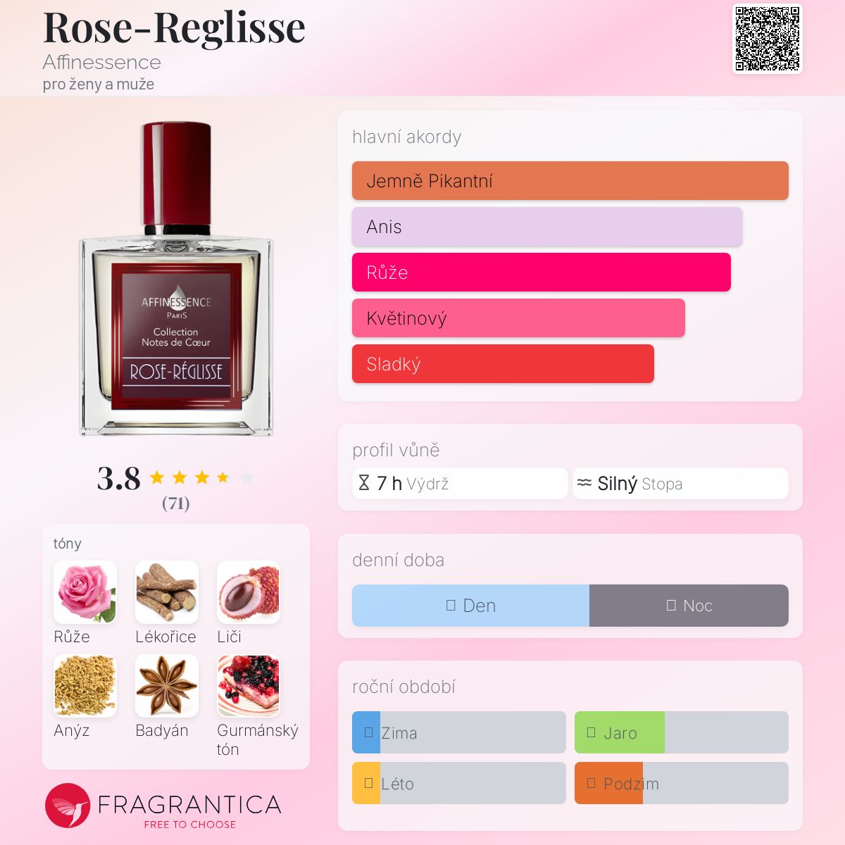Rose-Reglisse podle Affinessence je Floral vůně pro ženy a muže. Toto je nová vůně. Rose-Reglisse byl/a uveden/a v roce 2024. "Nosem" za touto vůní je Nathalie Lorson. Vrchní tón je Badyán ; střední tóny jsouTravní růže, Liči a Fialka ; základní tón je Gurmánský tón.