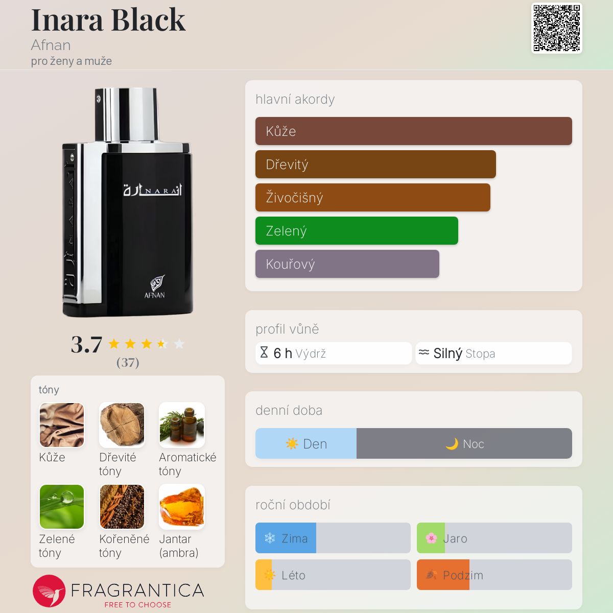 Inara Black podle Afnan je Leather vůně pro ženy a muže. Inara Black byl/a uveden/a v roce 2022. Vrchní tóny jsou Dřevité tóny, Aromatické tóny a Bylinné tóny; střední tóny jsouKořeněné tóny a Jantar (ambra) ; základní tóny jsou Kůže a Pižmo.