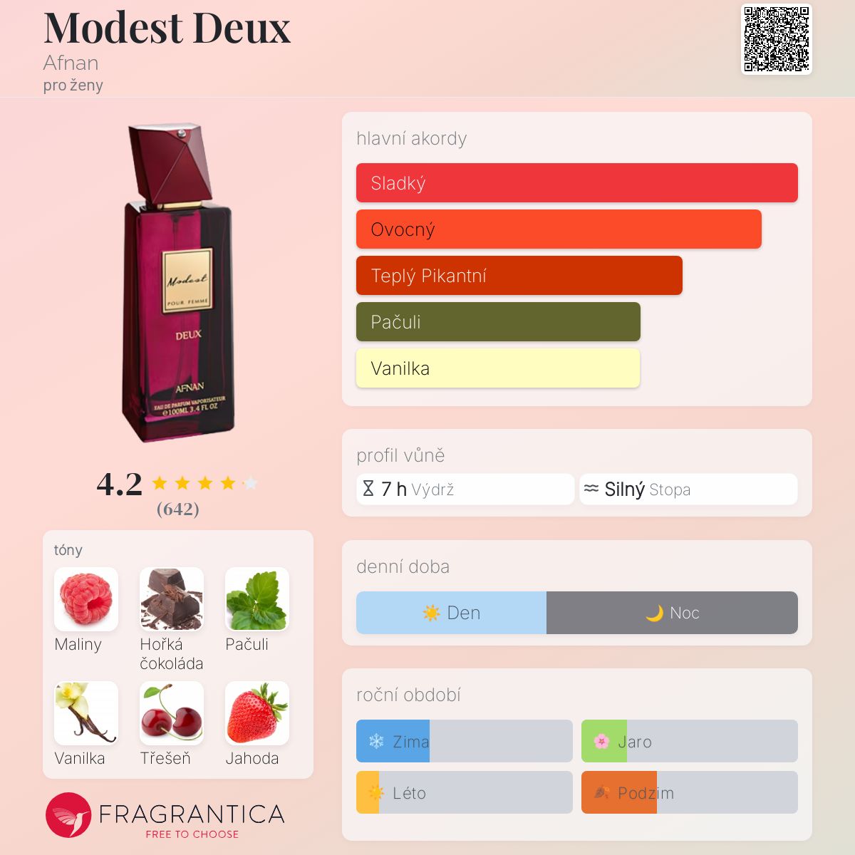 Modest Deux podle Afnan je vůně pro ženy. Modest Deux byl/a uveden/a v roce 2019. Vrchní tóny jsou Maliny, Hořká čokoláda, Jahoda a Třešeň; střední tóny jsouVanilka a Koření ; základní tóny jsou Pačuli, Pižmo a Gardénie.
