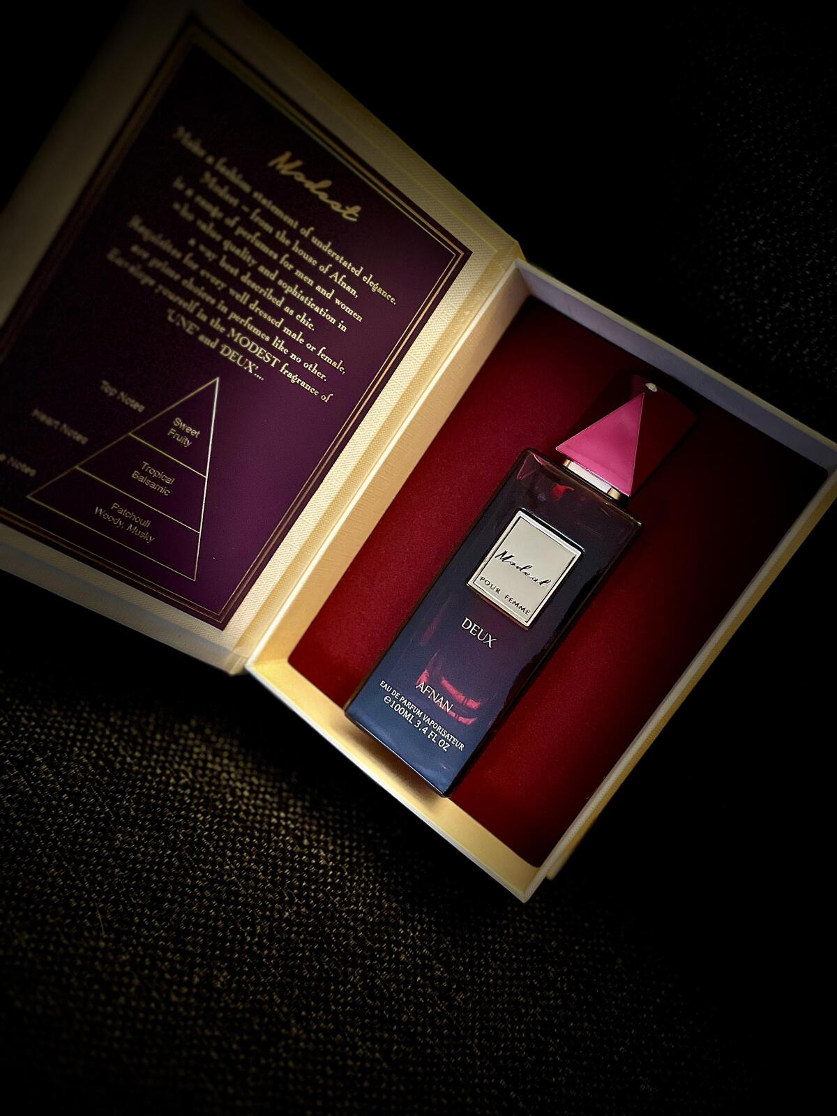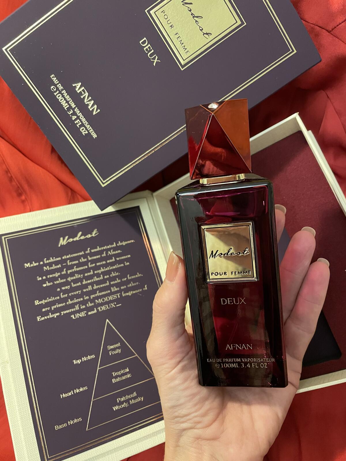 Na Modest Deux není vůbec nic skromného. Zaprvé, flakon v barvě červeného vína s malým drahokamem na uzávěru je naprosto nádherný a způsob, jakým je zabalen v kazetě, která uvádí pyramidu vůní, je tak luxusní.