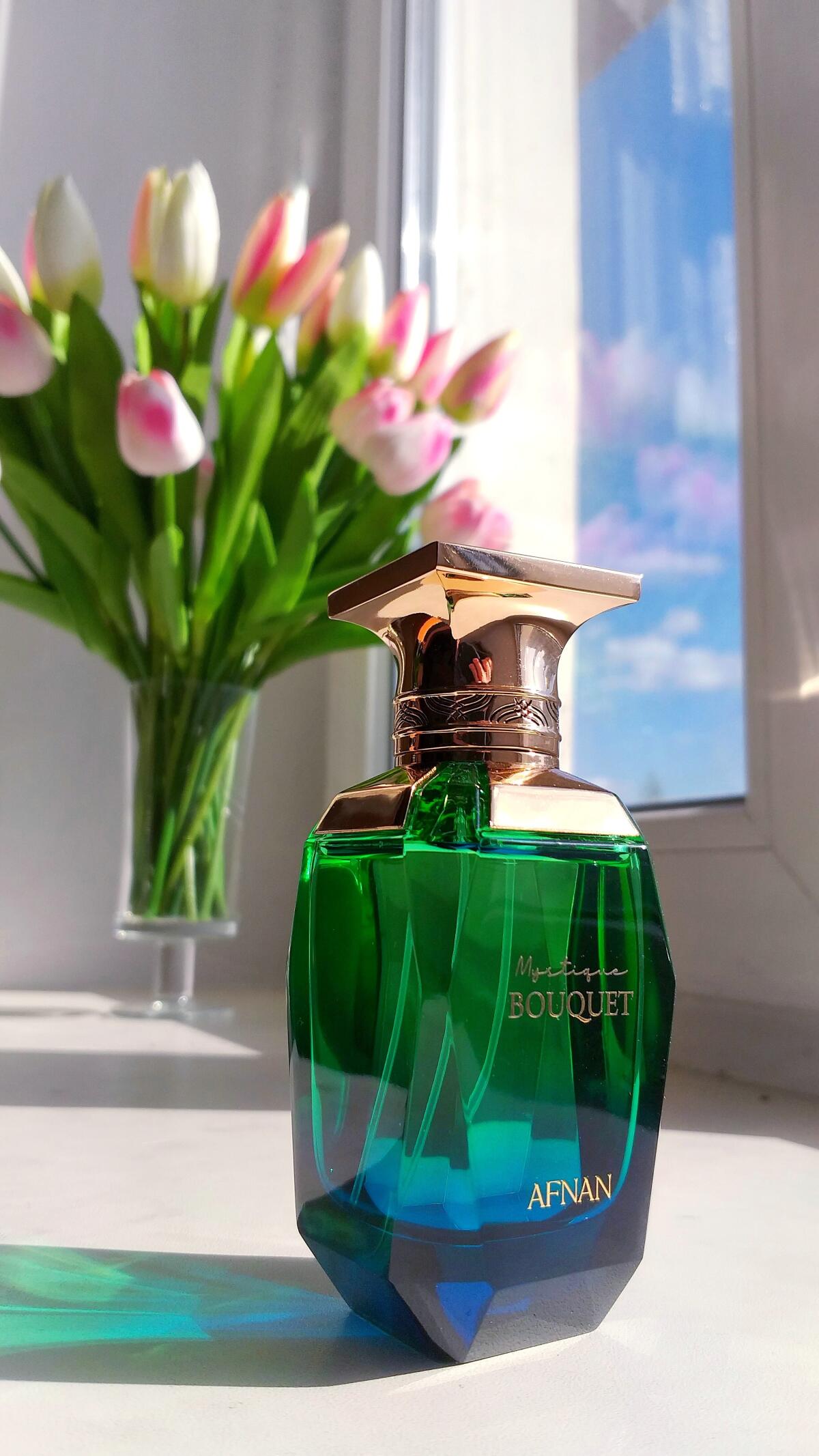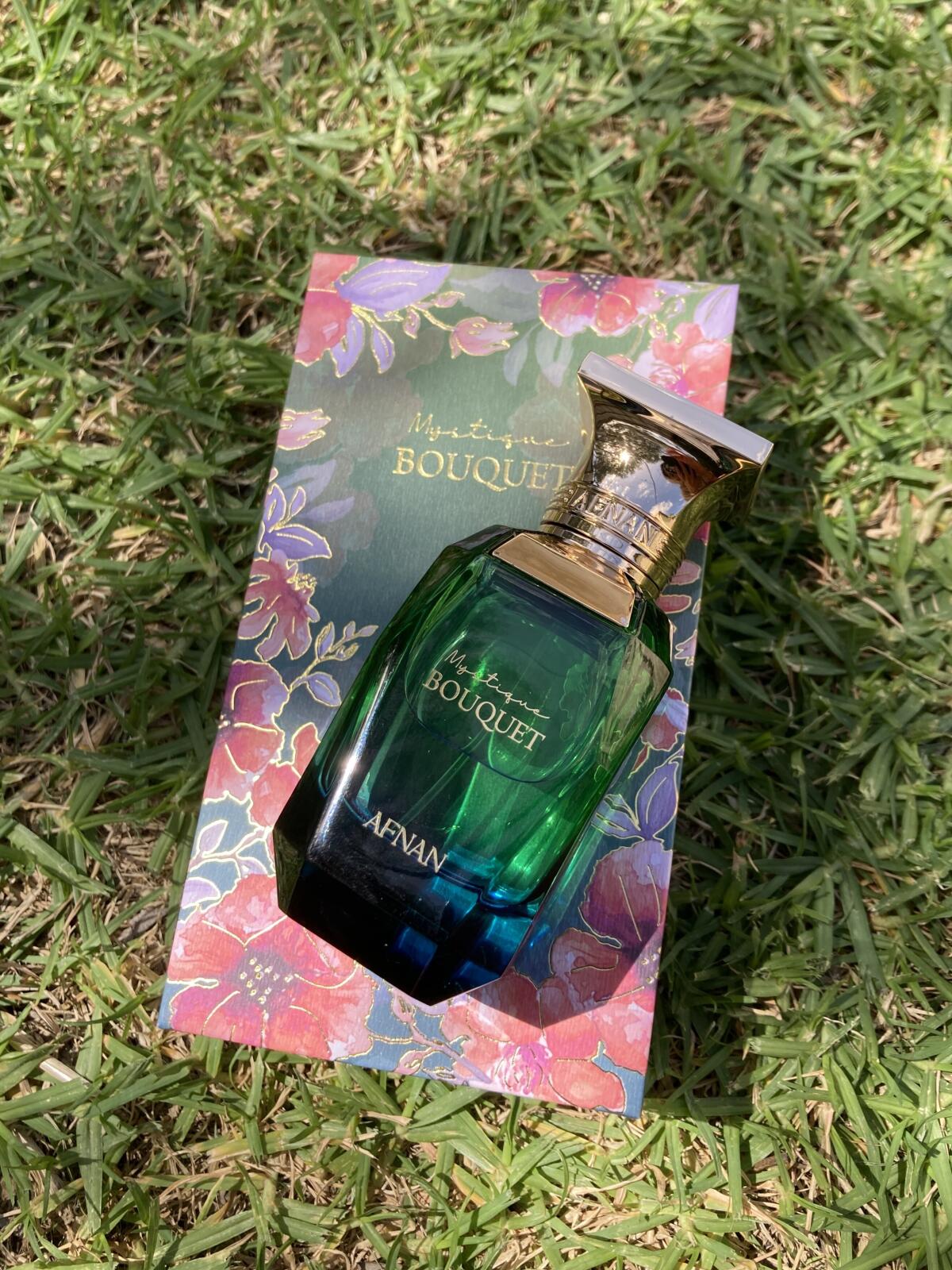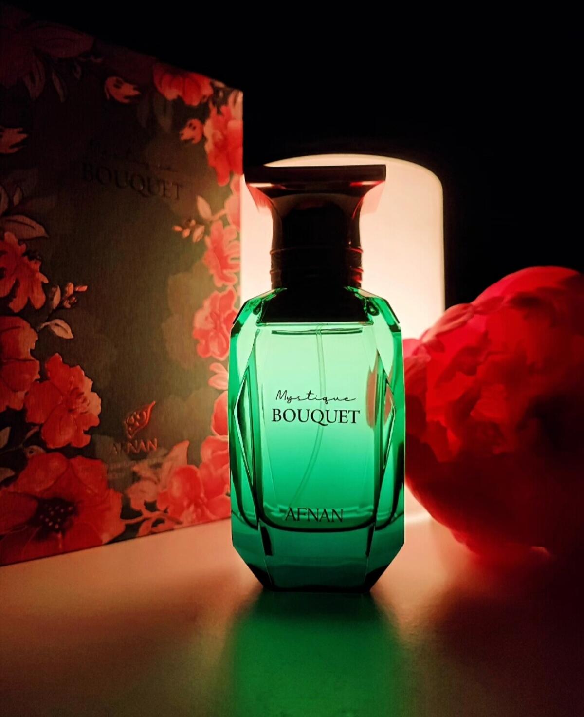 Mystique Bouquet podle Afnan je Floral Fruity vůně pro ženy. Toto je nová vůně. Mystique Bouquet byl/a uveden/a v roce 2024. "Nosem" za touto vůní je Imran Fazlani. Vrchní tóny jsou Bílá broskev, Mandarinka, Bergamot a Liči; střední tóny jsouPivoňka, Pomerančový květ, Vetiver a Mahónie ; základní tóny jsou Pižmo, Ambroxan, Vanilka a Dubový mech.