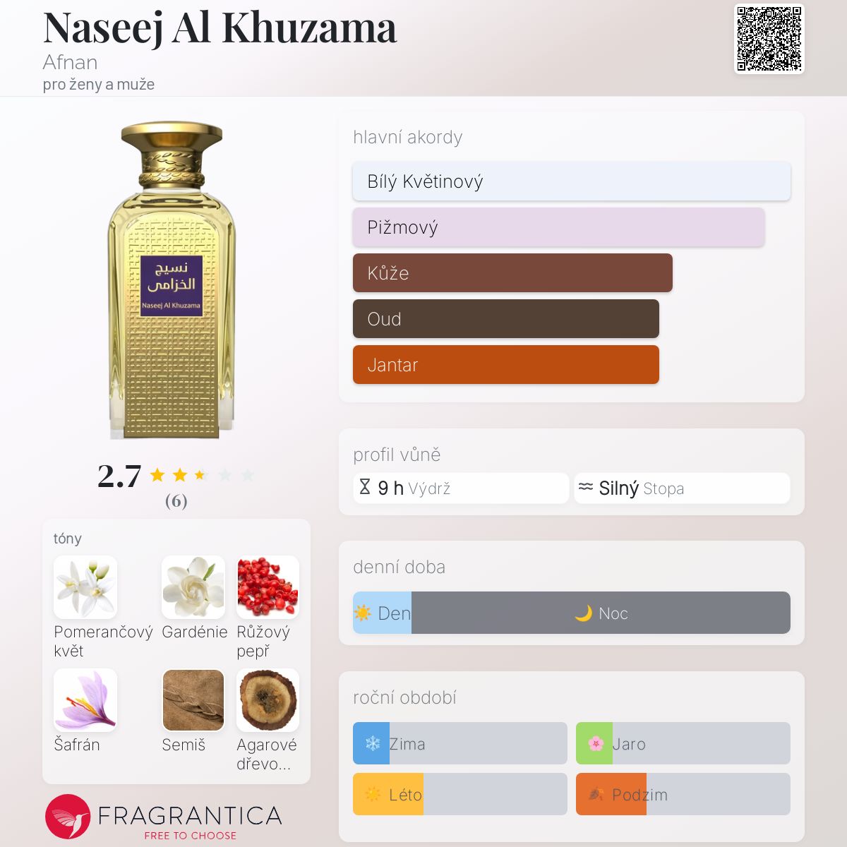 Naseej Al Khuzama podle Afnan je Orientální Woody vůně pro ženy a muže. Naseej Al Khuzama byl/a uveden/a v roce 2021. Vrchní tóny jsou Pomerančový květ, Gardénie a Růžový pepř; střední tóny jsouŠafrán, Semiš a Agarové dřevo (oud) ; základní tóny jsou Pižmo a Bílý jantar (ambra).