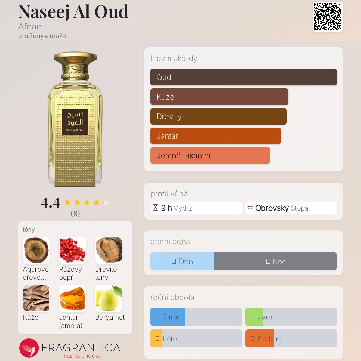 Naseej Al Oud podle Afnan je Leather vůně pro ženy a muže. Naseej Al Oud byl/a uveden/a v roce 2021. Vrchní tóny jsou Agarové dřevo (oud), Růžový pepř, Bergamot a Šafrán; střední tóny jsouDřevité tóny, Růže, Jasmín a Orris ; základní tóny jsou Agarové dřevo (oud), Kůže a Jantar (ambra).