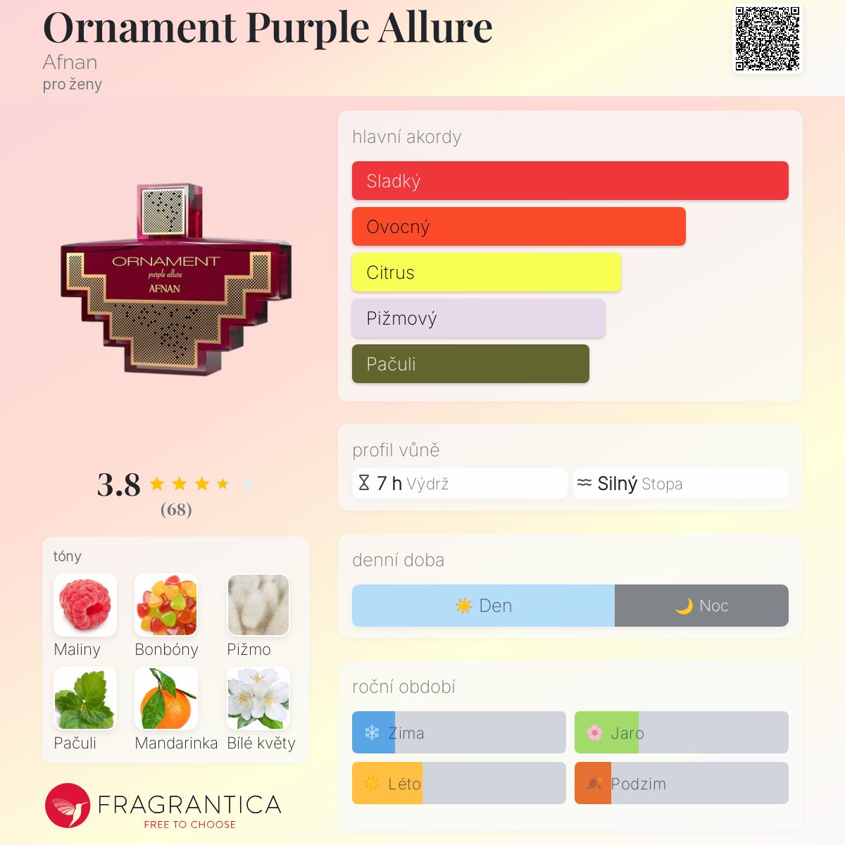 Ornament Purple Allure podle Afnan je Floral Woody Musk vůně pro ženy. Ornament Purple Allure byl/a uveden/a v roce 2021. Vrchní tóny jsou Maliny, Mandarinka a Grapefruit; střední tóny jsouSladké tóny, Bílé květy, Anýz a Kardamom ; základní tóny jsou Pižmo, Pačuli a Vanilka.