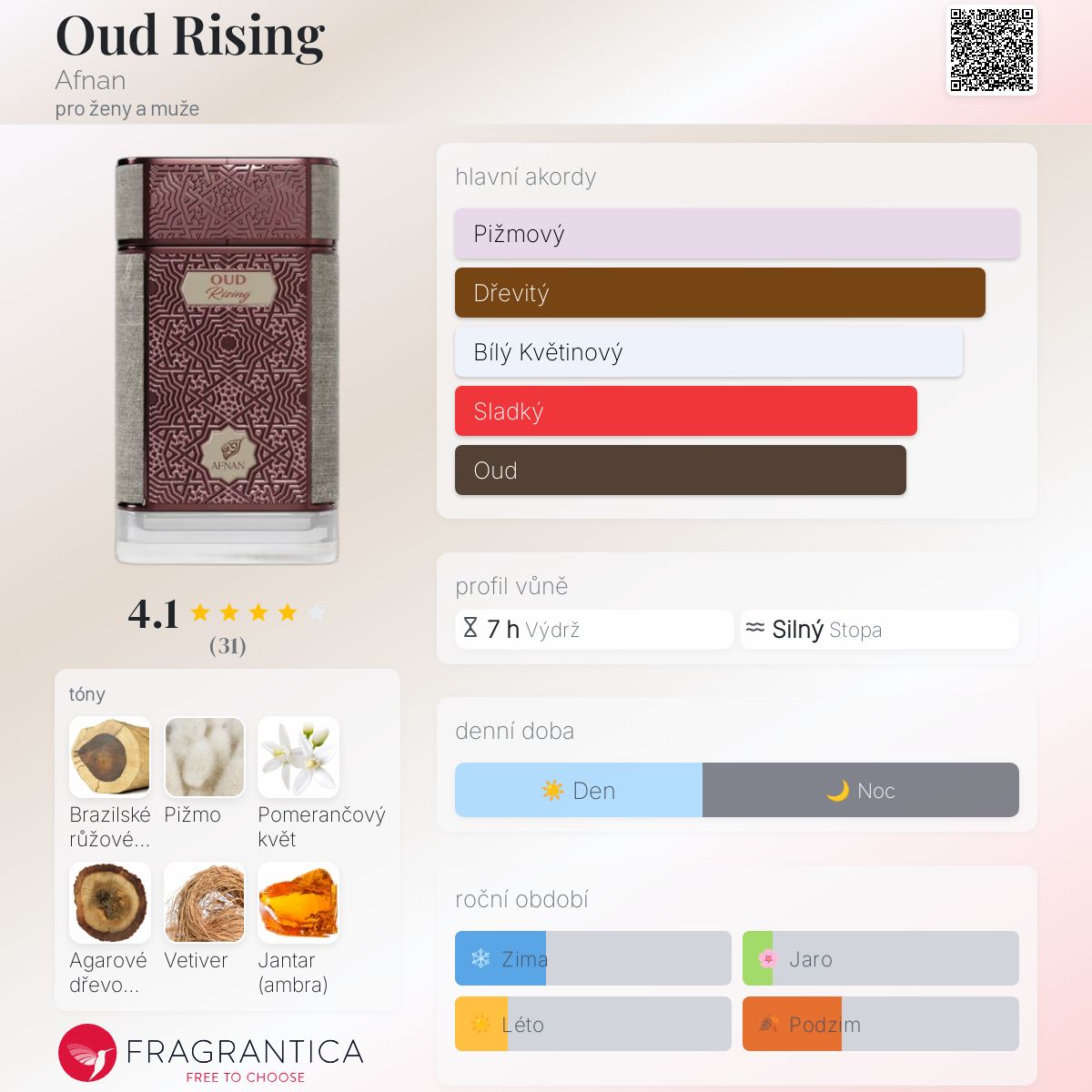 Oud Rising podle Afnan je Woody Spicy vůně pro ženy a muže. Oud Rising byl/a uveden/a v roce 2023. "Nosem" za touto vůní je Imran Fazlani. Vrchní tóny jsou Pomerančový květ, Agarové dřevo (oud) a Cypřiš; střední tóny jsouBrazilské růžové dřevo, Jantar (ambra) a Kardamom ; základní tóny jsou Pižmo, Vetiver a Fazole tonka.