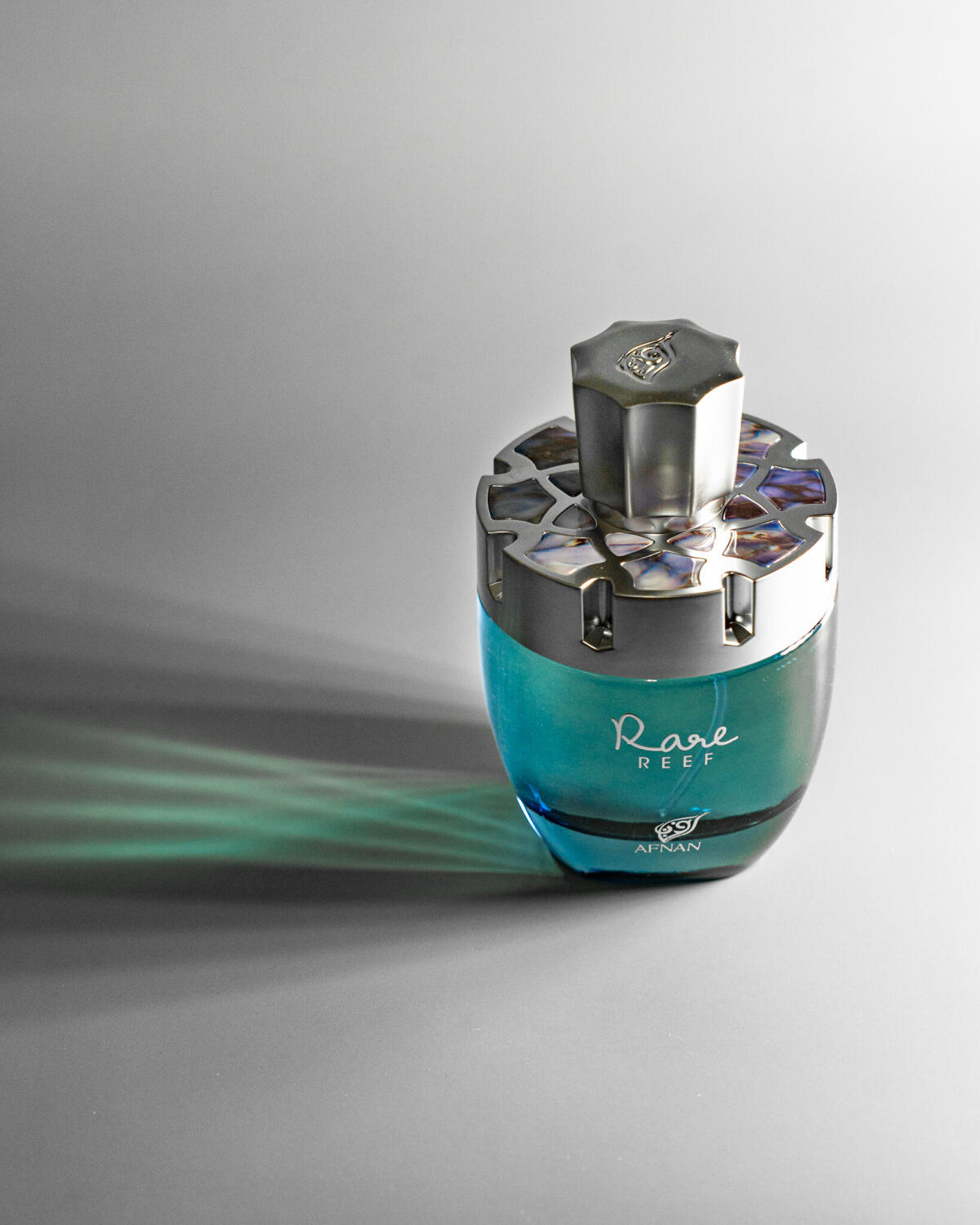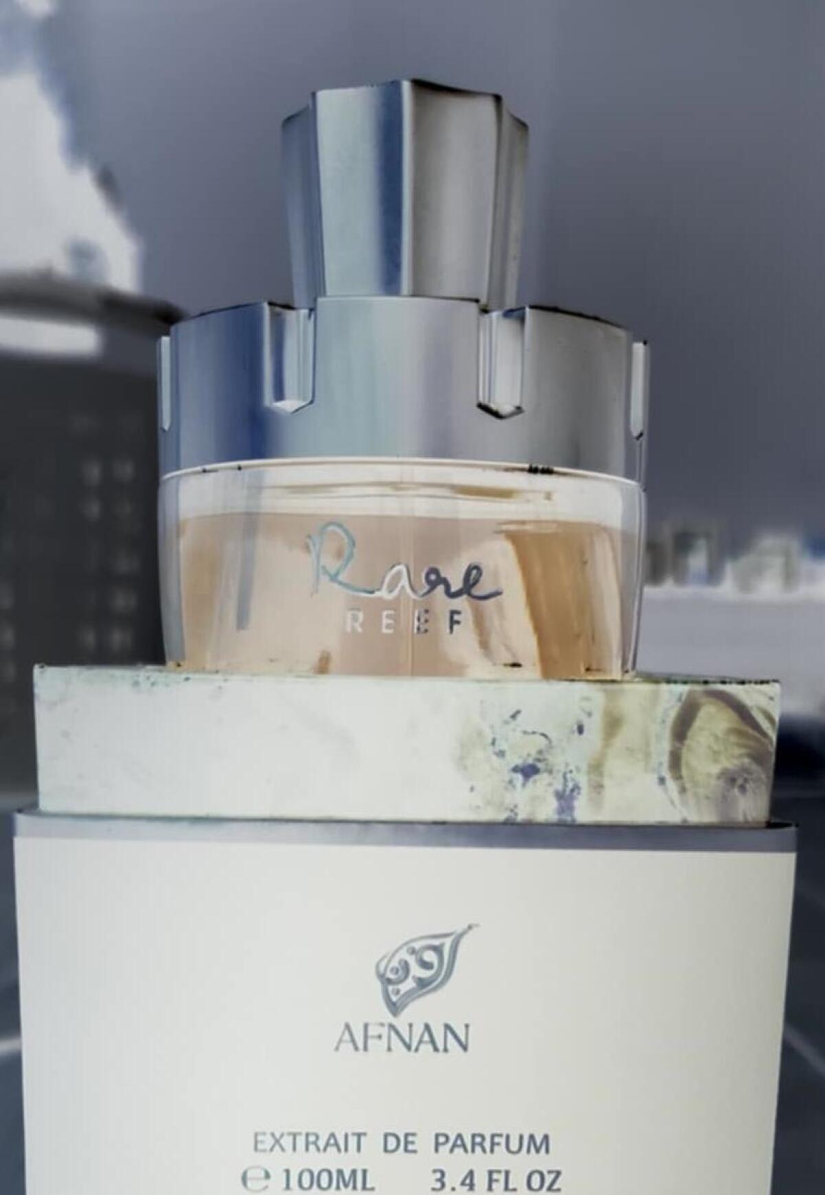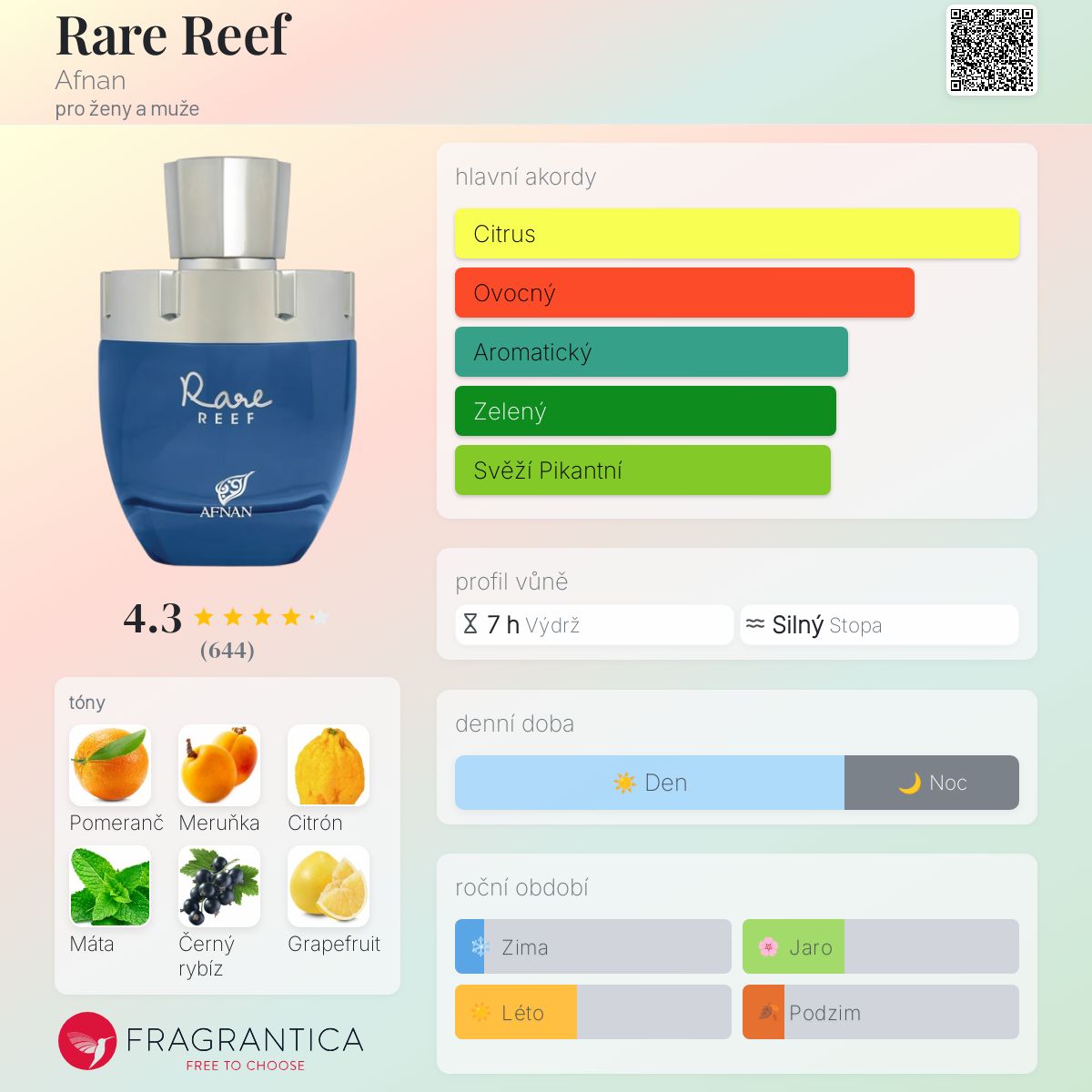 Rare Reef podle Afnan je Aromatic Fruity vůně pro ženy a muže. Toto je nová vůně. Rare Reef byl/a uveden/a v roce 2025. "Nosem" za touto vůní je Lucas Sieuzac. Vrchní tóny jsou Pomeranč, Citrón, Máta, Černý rybíz, Grapefruit a Koriandr; střední tóny jsouMeruňka, Fialkový list, Růže a Bazalka ; základní tóny jsou Fík, Ambrette (přírodní pižmo), Jantarové dřevo a Datle.
